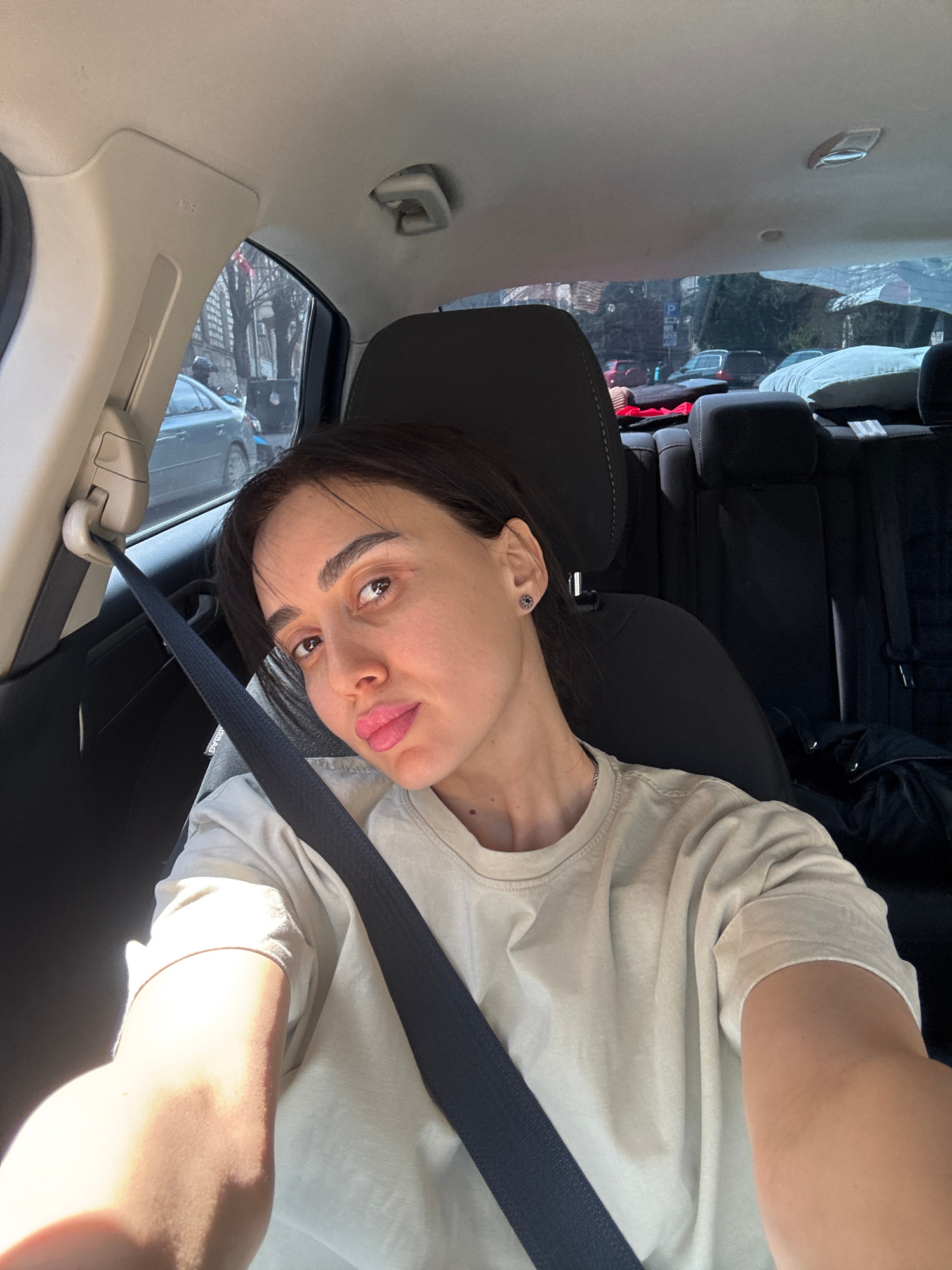 A woman is taking a selfie while sitting in the passenger seat of a car. She is wearing a light-colored t-shirt and a dark seatbelt. The interior of the car is visible, including the seats and window.…read more