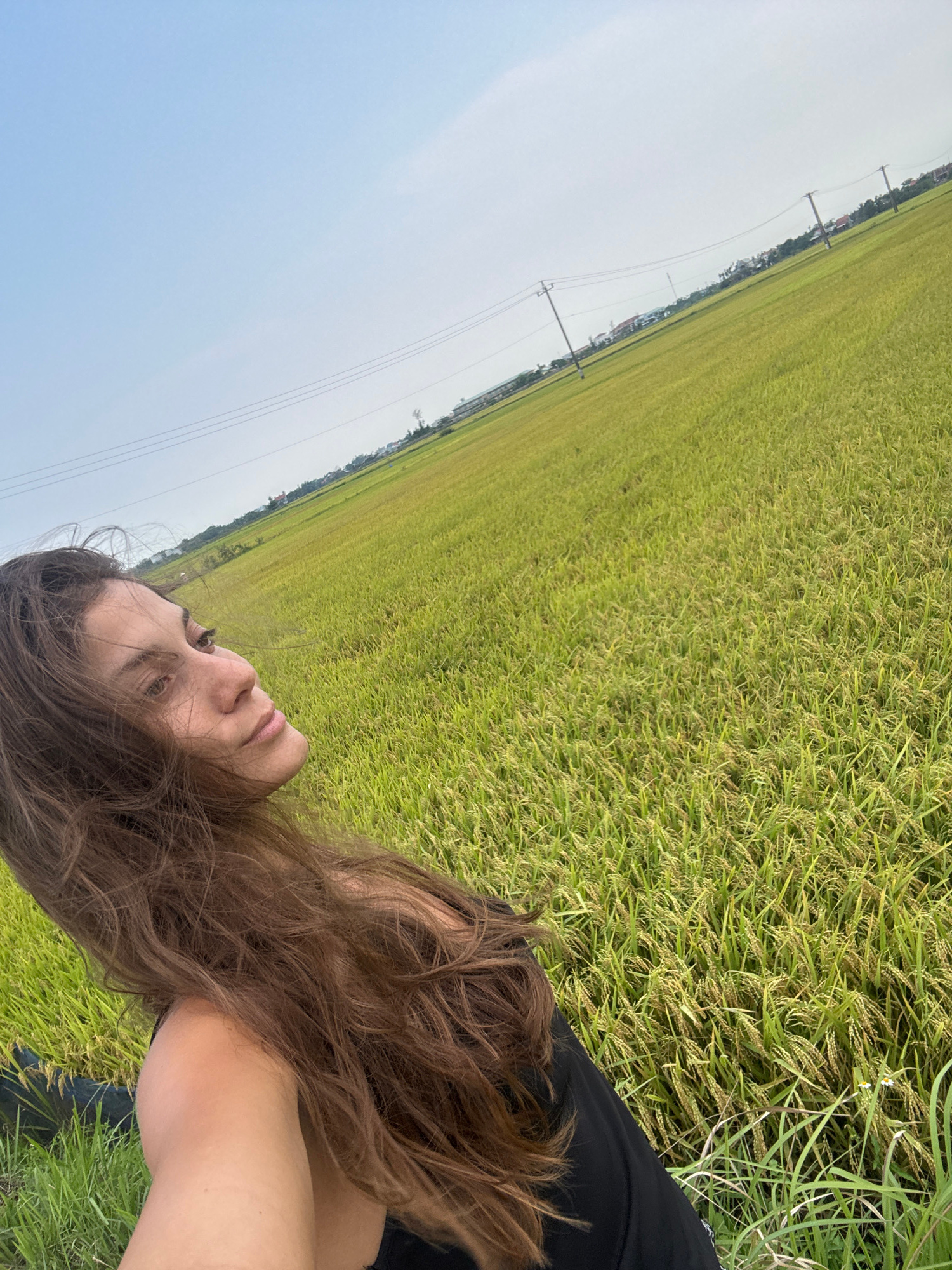 The image captures a person amidst an expansive green field, likely a rice paddy, under a bright sky in Đà Nẵng, Vietnam. In the foreground, positioned in the lower right, is a woman with long, wavy d…read more