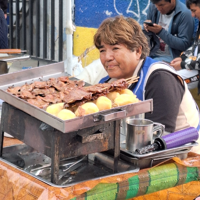 A woman stands beside a food cart displaying skewers of meat and potatoes. The cart features a stainless steel container with grilling implements and a purple pump-like device on top. People are visib…read more