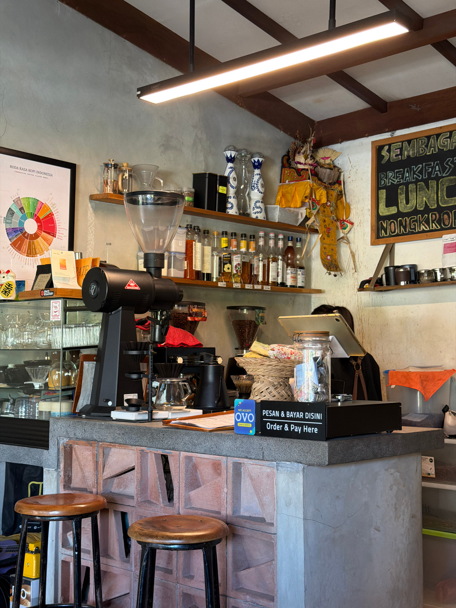 Here's a detailed description of the image: **Location:** A business setting, possibly a cafe or coffee shop, in Kerobokan Kelod, Indonesia (identified by the "RODA RASA KOPI INDONESIA" flavor wheel)…read more