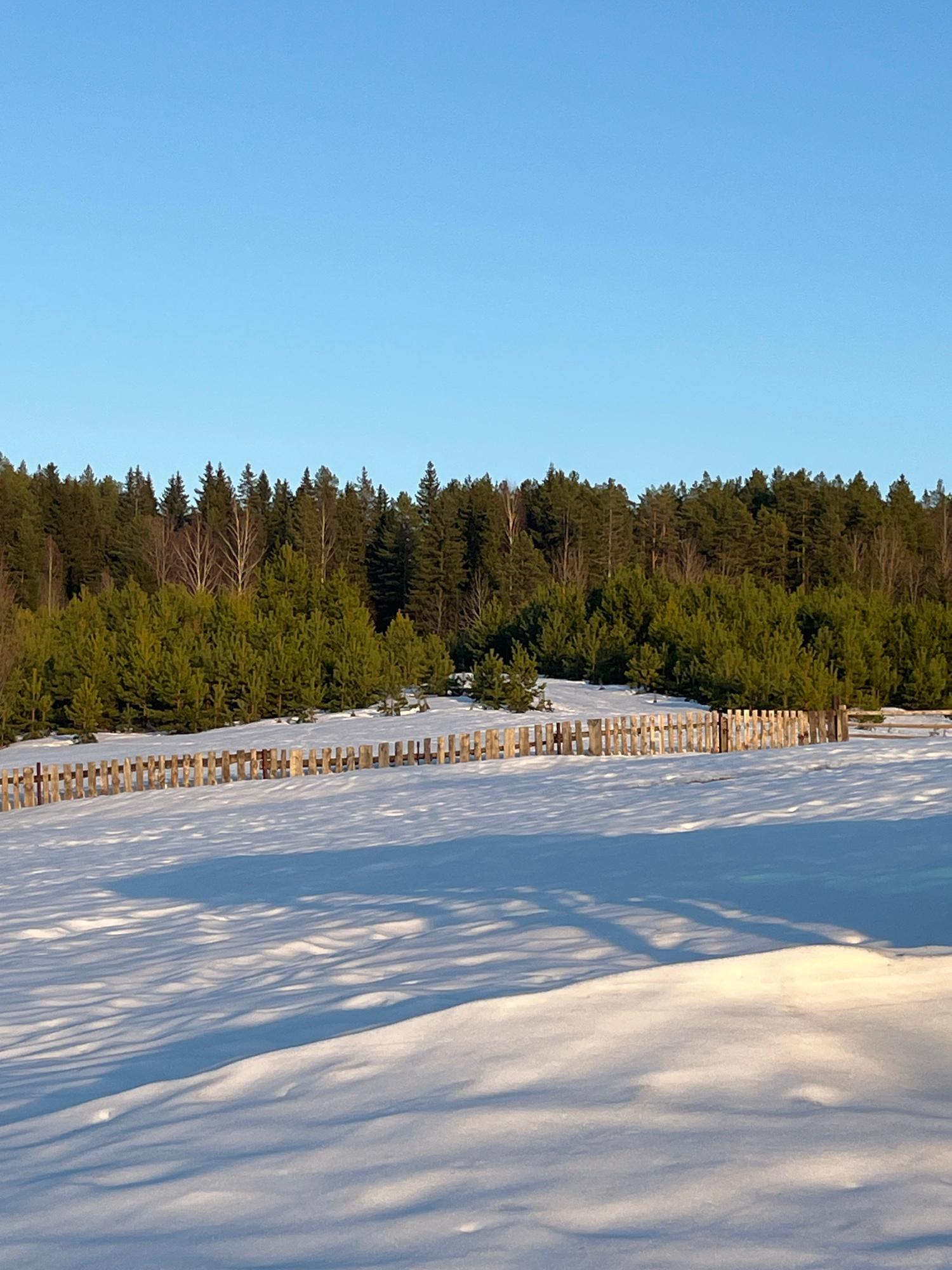 The image depicts a winter scene in Большой Букор, Russia. A dense evergreen forest borders a snow-covered field or open area. A wooden fence runs along the edge of the forest, separating it from the…read more