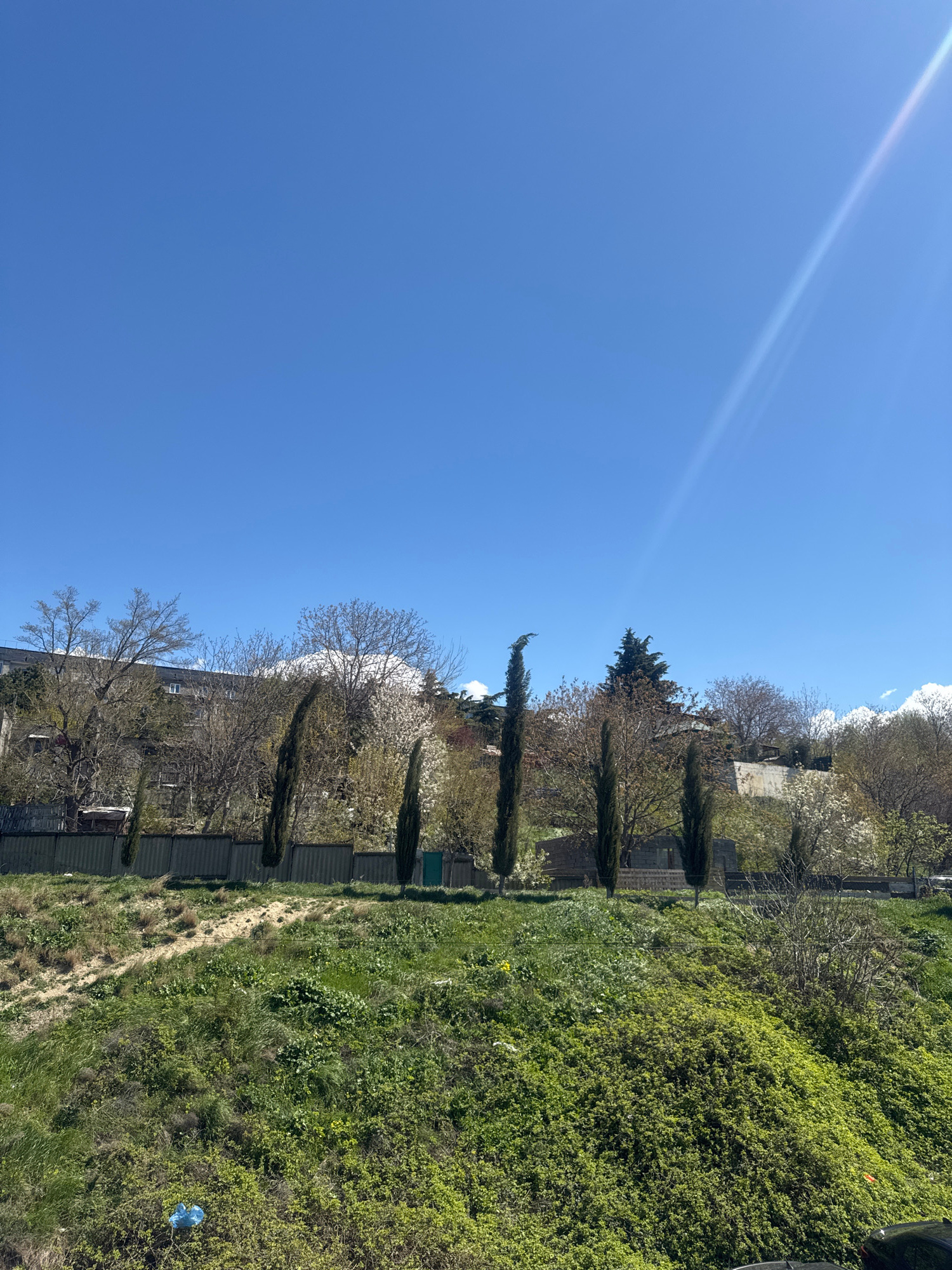 The image is a landscape oriented shot taken in Tbilisi, Georgia, likely in a residential area. The sky is a clear blue with a bright sunlight glare in the upper left portion of the frame. The foregro…read more