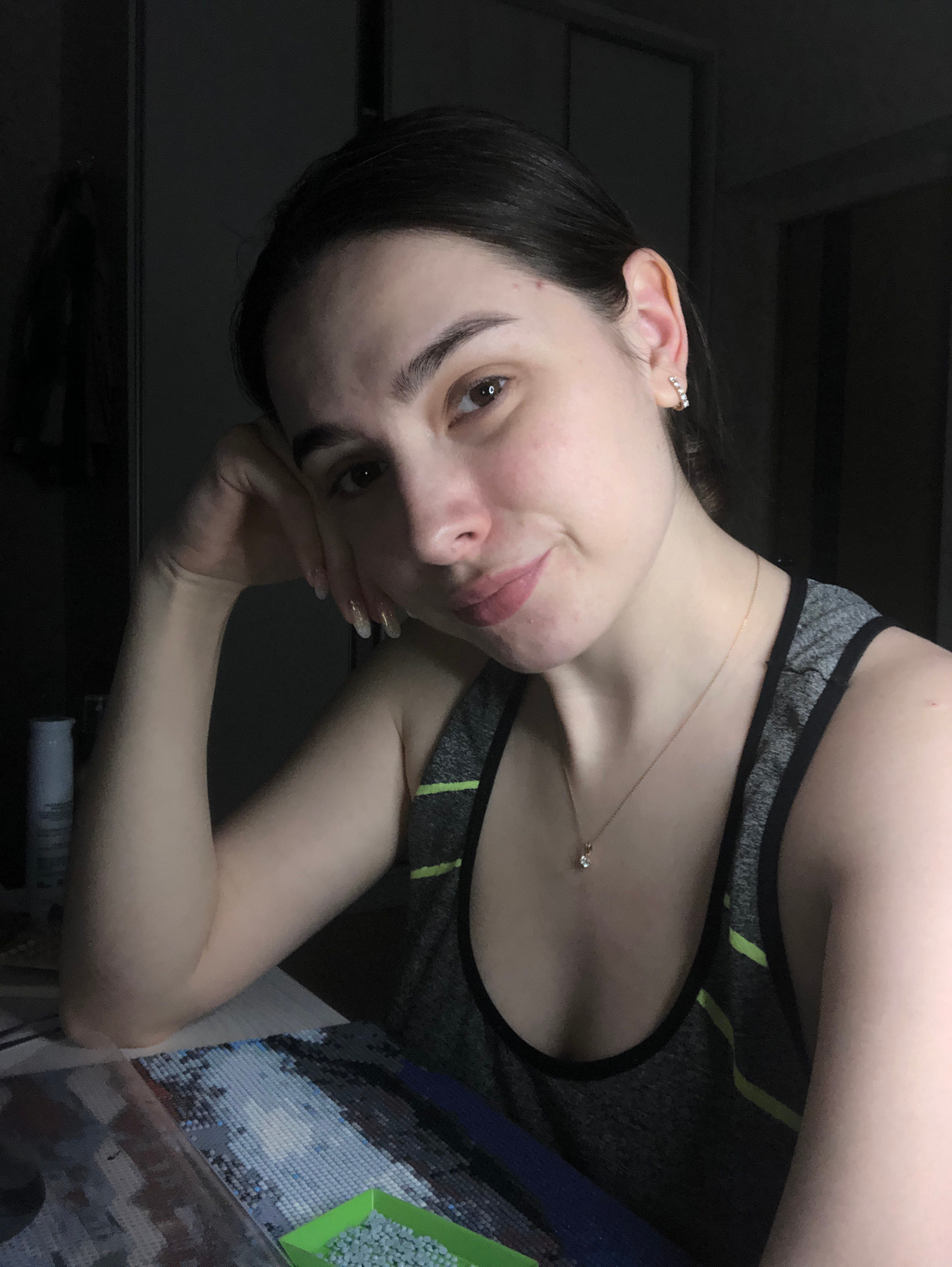 A woman is looking directly at the camera with a slight smile. She is resting her head on her hand. She has dark hair and fair skin and is wearing a gray tank top with black trim and lime green stripeβ¦read more