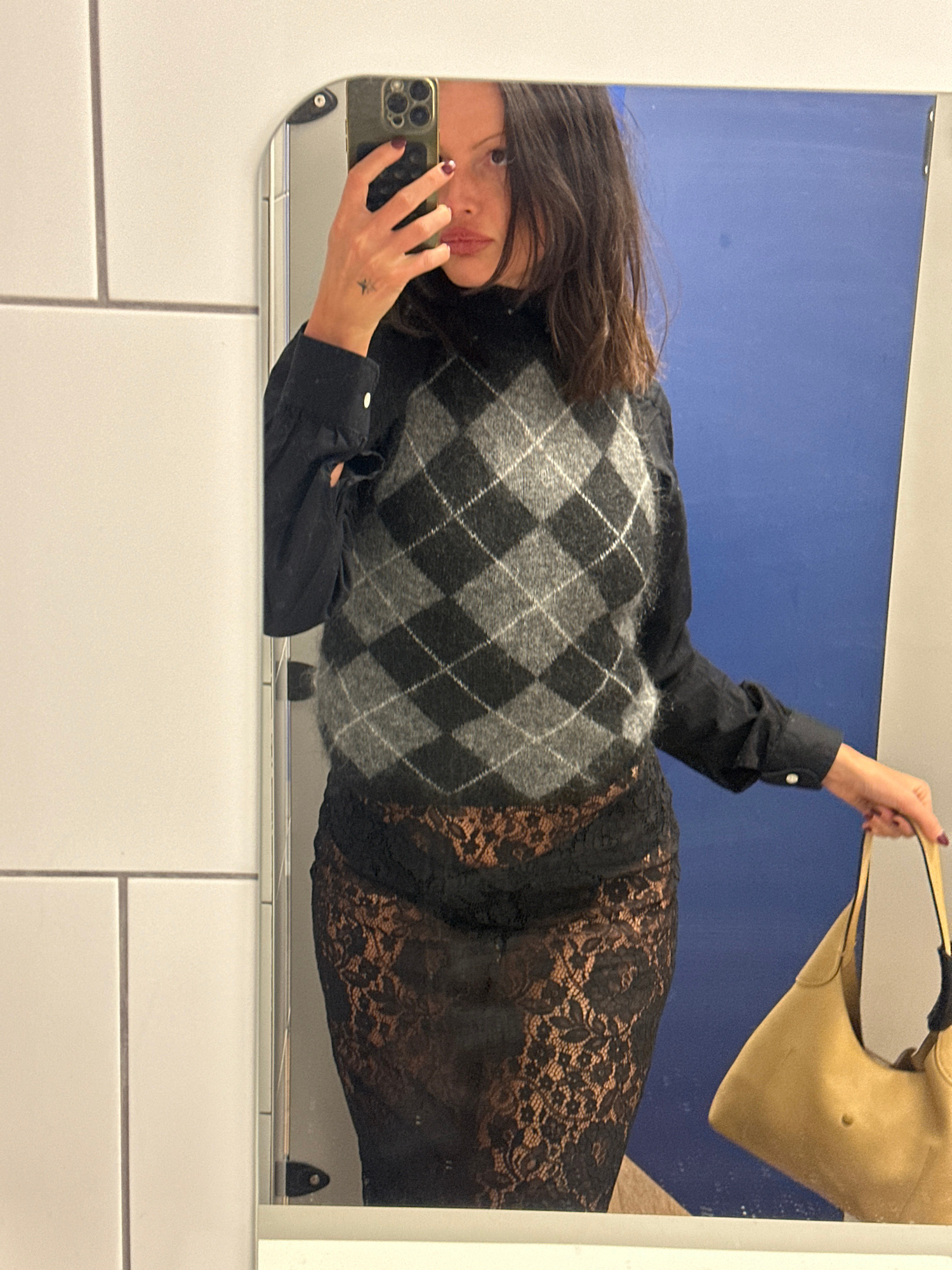 A woman is taking a selfie in a restroom mirror. She is wearing a black long-sleeved shirt, a gray and black argyle sweater vest, and a black lace skirt. She is holding a tan purse. The background inc…read more