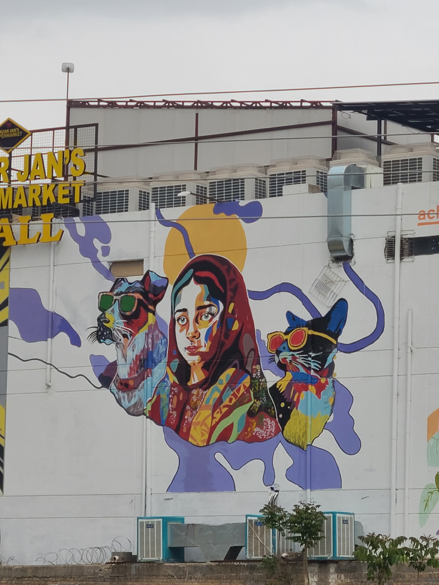 The image shows a building in Quetta City Tehsil, Pakistan, with a large mural painted on its side. The mural depicts a woman's face with vibrant colors and abstract patterns, positioned above two cat…read more