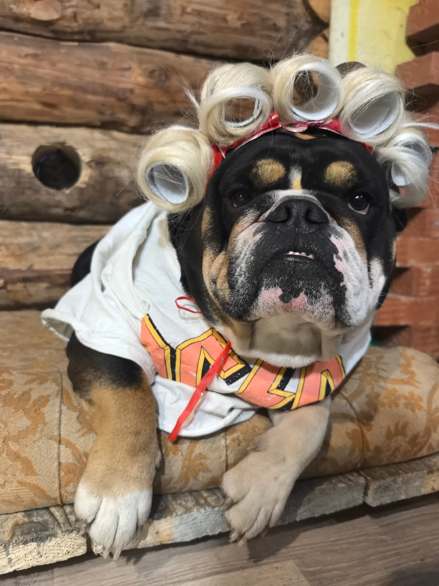 A bulldog is photographed indoors in Noviy, Russia. The dog wears a white t-shirt and a red and orange collar. It has hair curlers around its head. The dog lies on a patterned cushion on top of a wood…read more