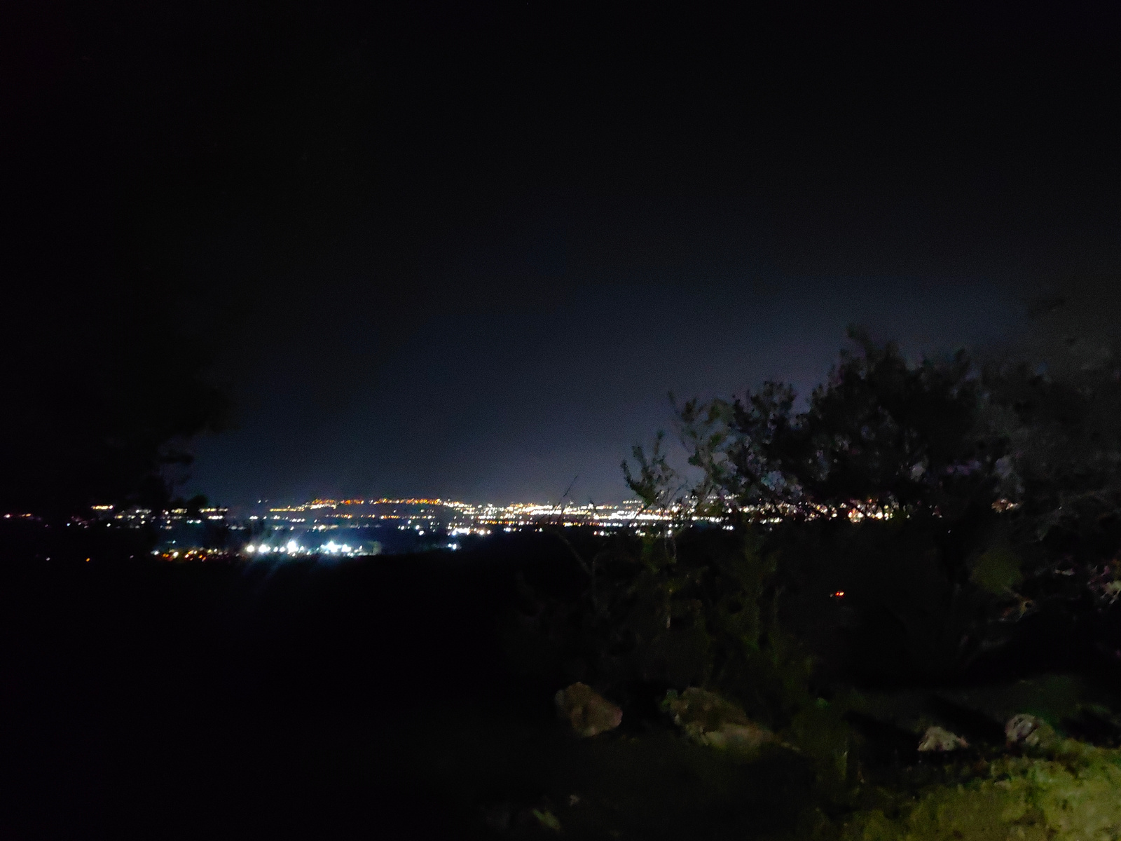 The image depicts a nighttime scene overlooking the city of Sofia, Bulgaria. The foreground is dark, with trees and vegetation silhouetted against the night sky. In the distance, the city lights of So…read more