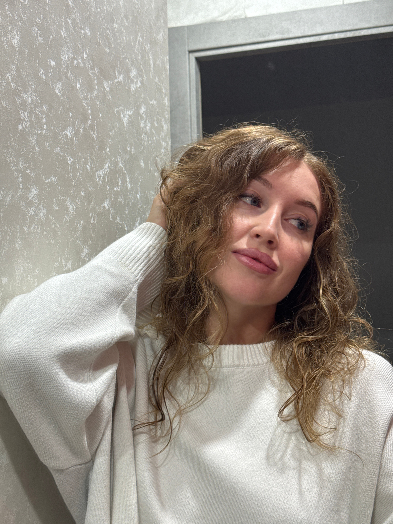 A woman with curly brown hair and a white sweater is resting her head on a gray countertop. The background features a window frame and a dark gray or black wall. The scene is indoors. No further infor…read more