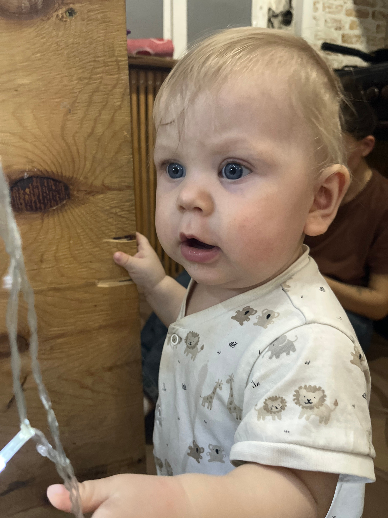 A baby with blonde hair and blue eyes, wearing a white shirt with animal patterns, is looking at the camera. The baby is leaning over a wooden surface with a visible knot. A string of lights is near t…read more