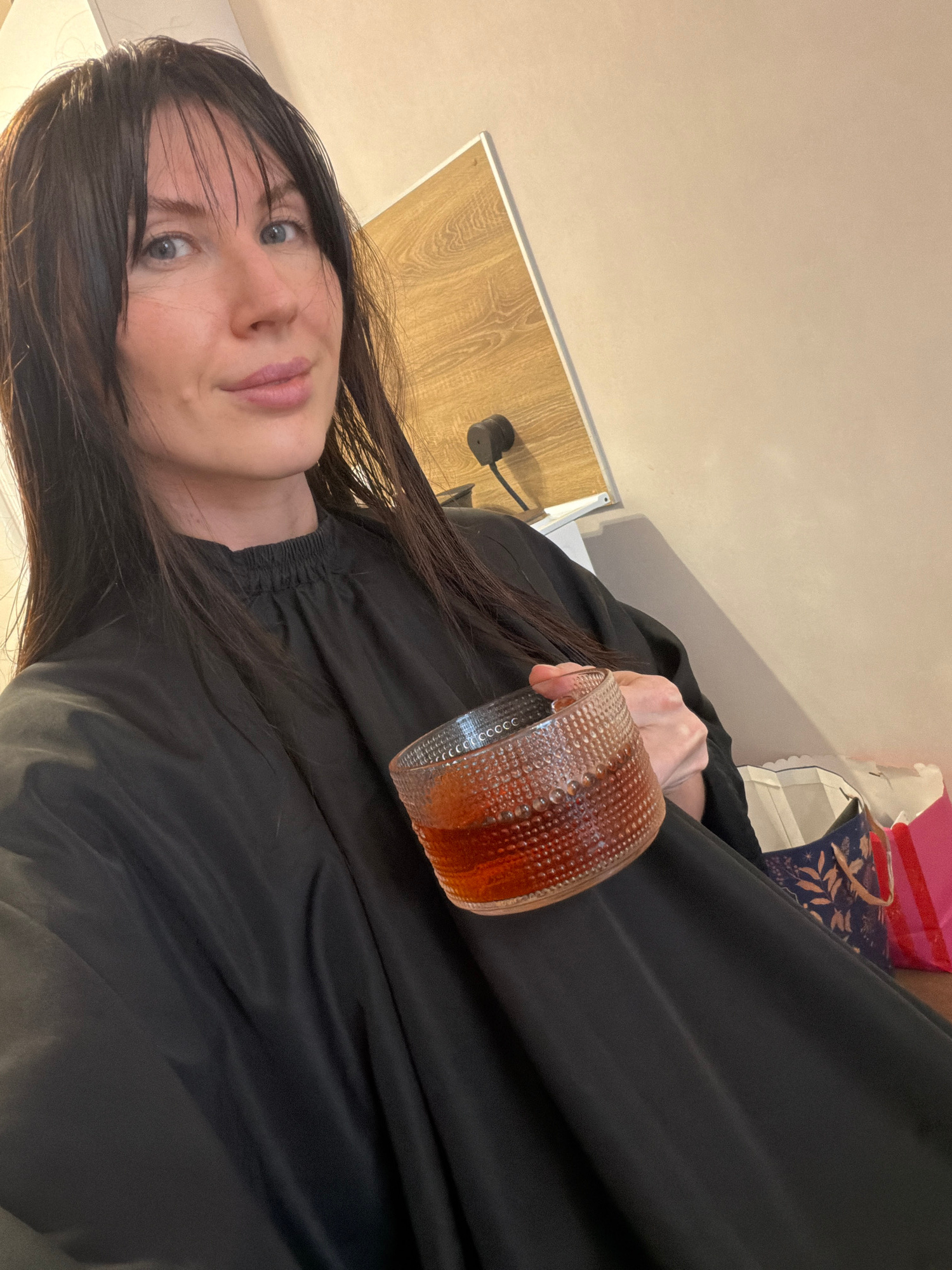 A woman with dark hair and bangs is holding a glass of amber-colored liquid. She's wearing a black garment, possibly a salon cape. The background includes a light-colored wall, a section of wood-grain…read more