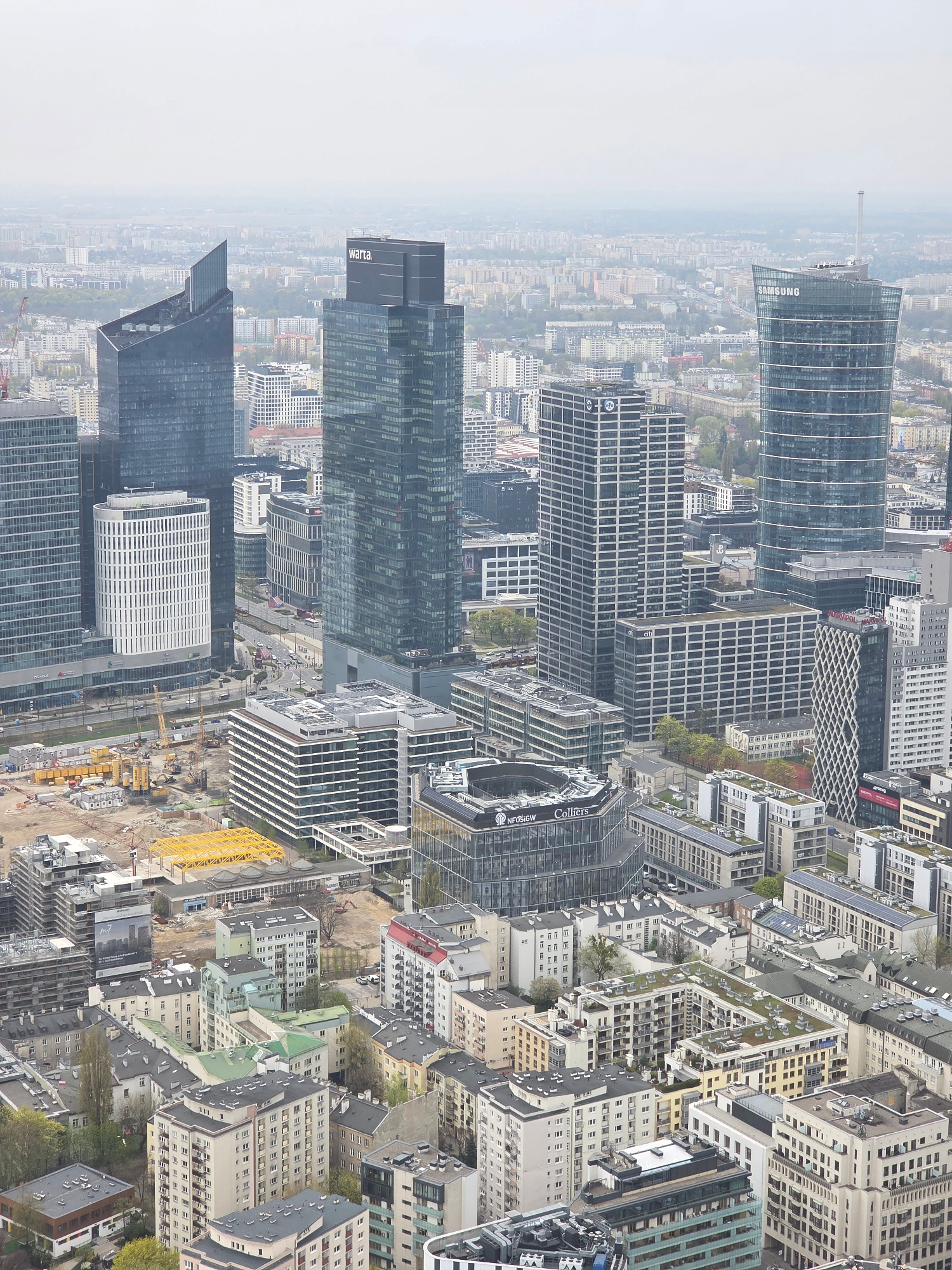 The image shows an aerial view of Warsaw, Poland, dominated by modern skyscrapers and interspersed with older buildings. Skyscrapers with glass facades form the core of the cityscape. A large construc…read more