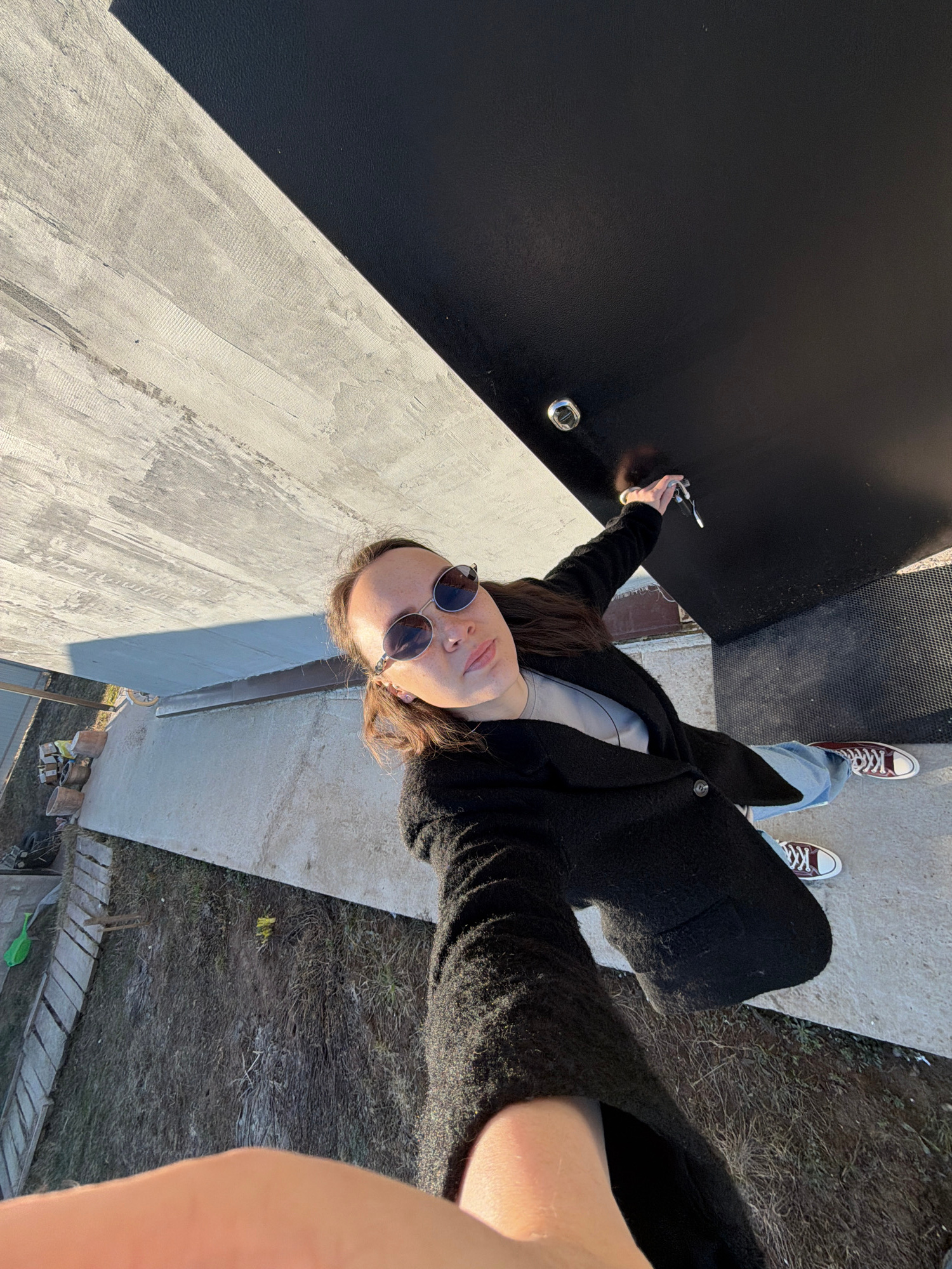 A young woman captures a selfie outdoors in Chaikovsky, Russia. She is positioned with a dark, textured vertical surface to her left, contrasting with a light-colored concrete ground extending to herβ¦read more