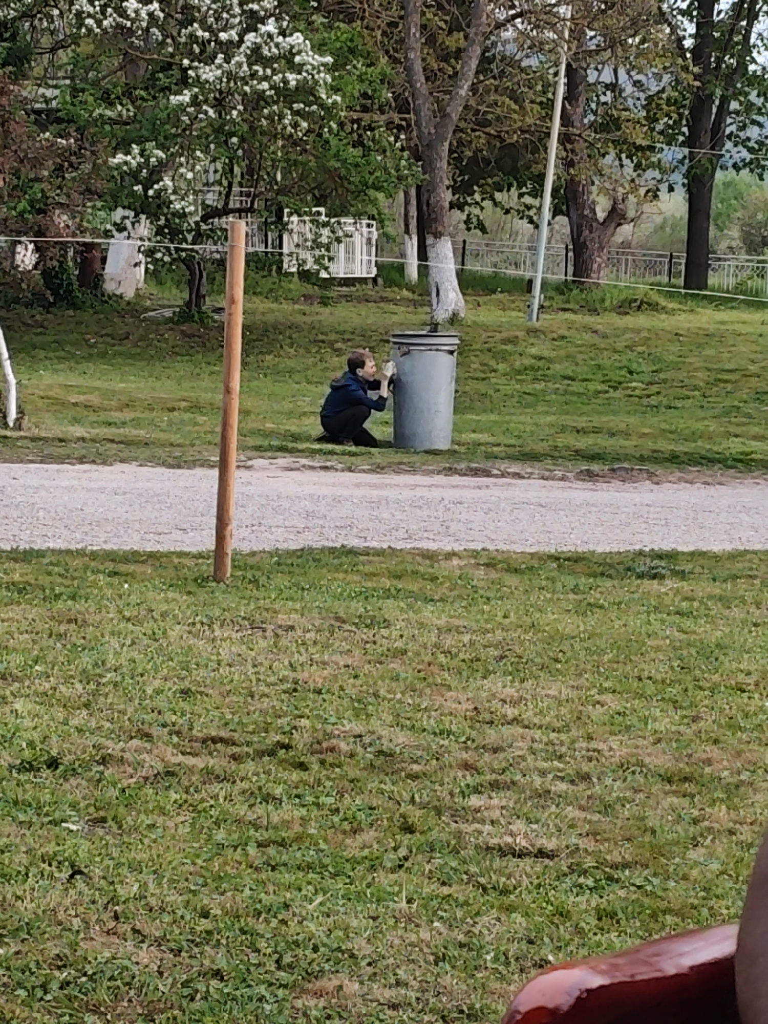 The image shows an outdoor scene in an area with trees and green grass. A young person is crouching next to a gray trash can. There is a dirt road running through the scene. A wooden post is visible n…read more