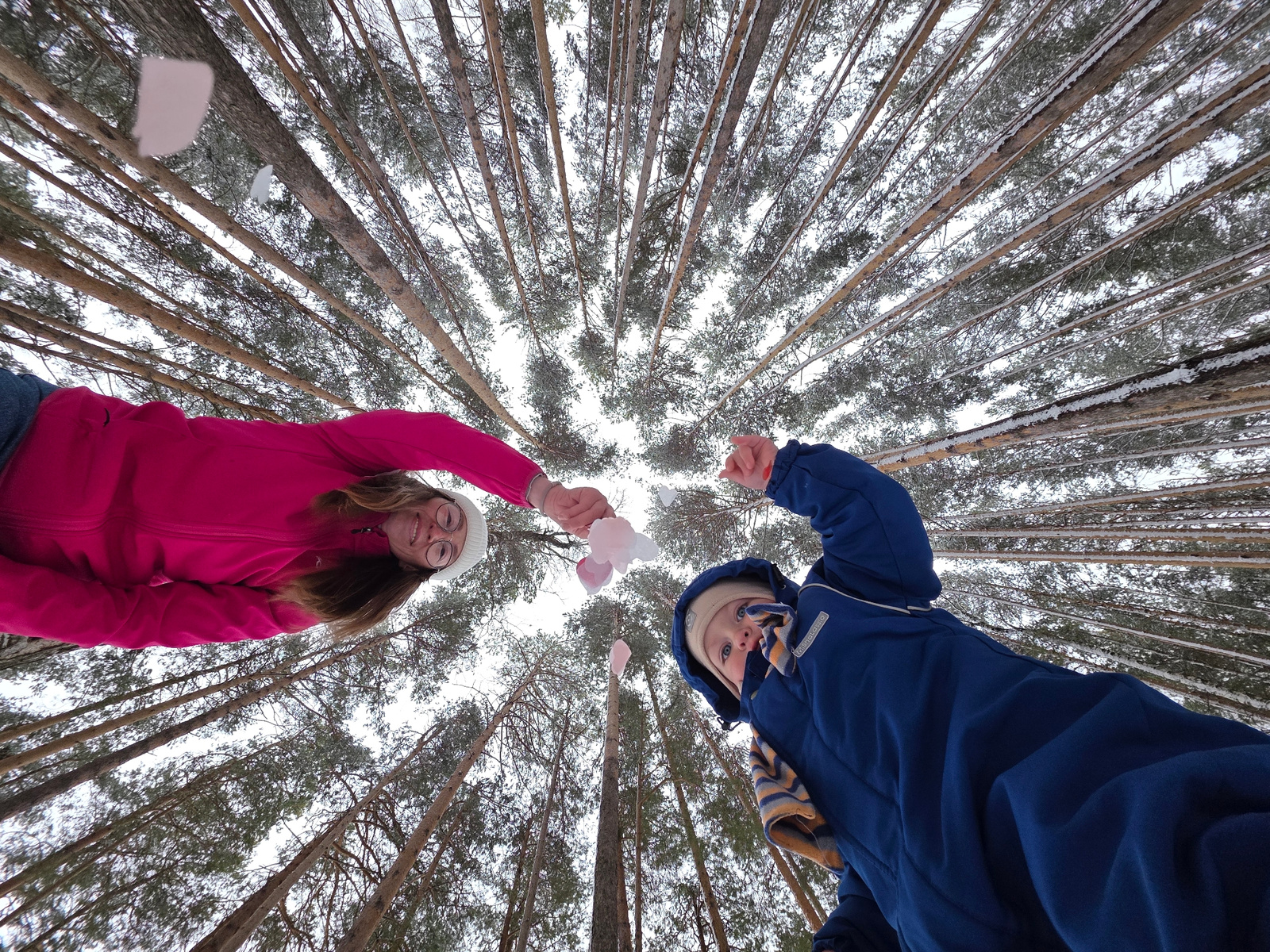 From a low-angle perspective in a snowy forest near Chaikovsky, Russia, a child in a blue snowsuit and a woman in a pink jacket are visible. The view is looking straight up at the sky through tall, th…read more