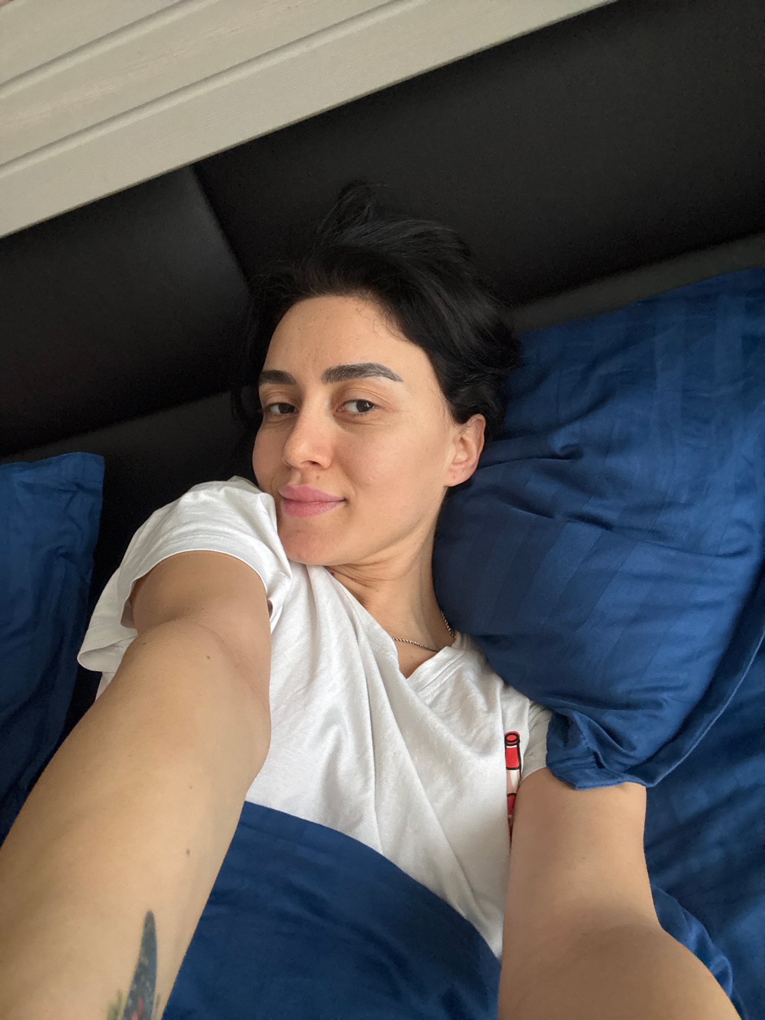 An adult female is depicted in a selfie, lying in a bed within what appears to be a bedroom. She has a medium skin tone, dark brown hair, and dark eyebrows, looking directly at the camera with a sligh…read more