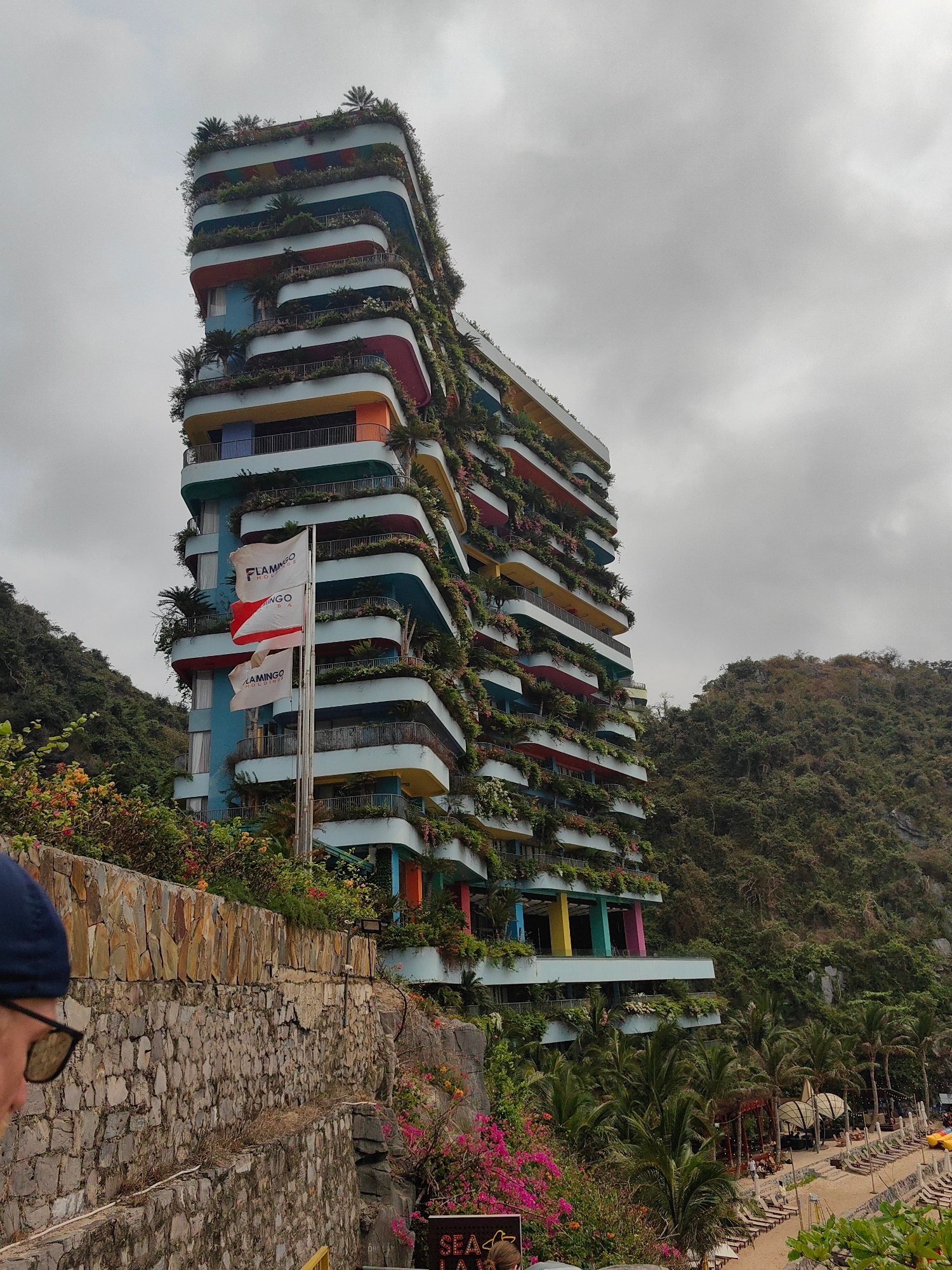 The image depicts the Flamingo Cat Ba Beach Resort, a high-rise hotel in Hải Phòng, Vietnam. The building is characterized by its terraced architecture, with each level adorned with vegetation, creati…read more