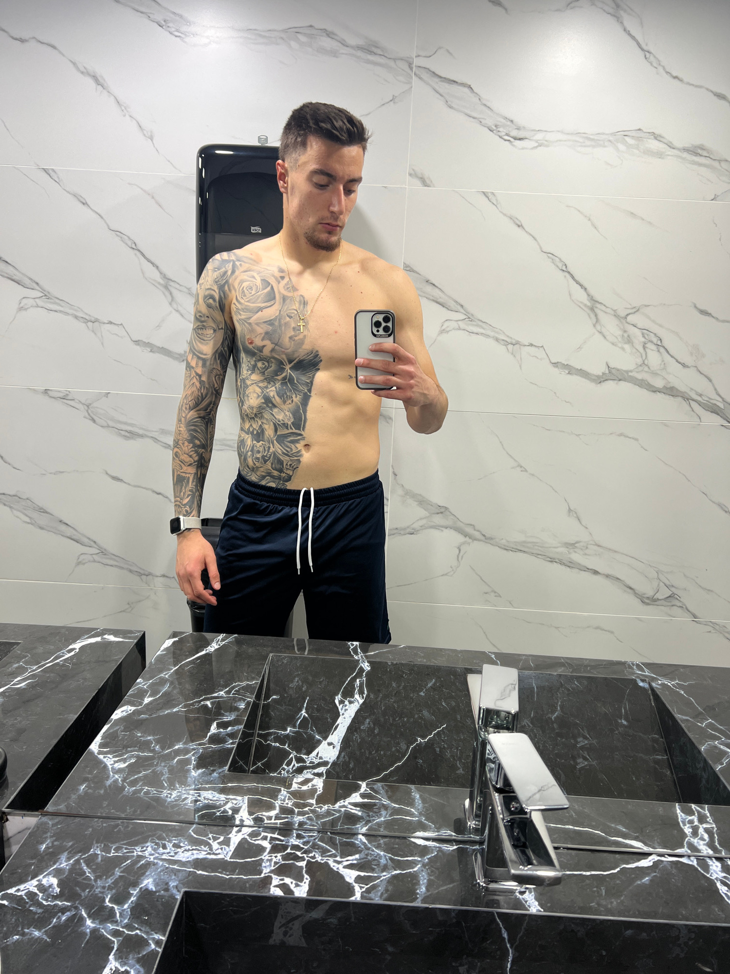A slender, light-skinned man with tattoos is in a bathroom. He has an arm covered in tattoos. He is wearing black shorts with a white drawstring. He is holding a phone, taking a selfie. He is bare-che…read more