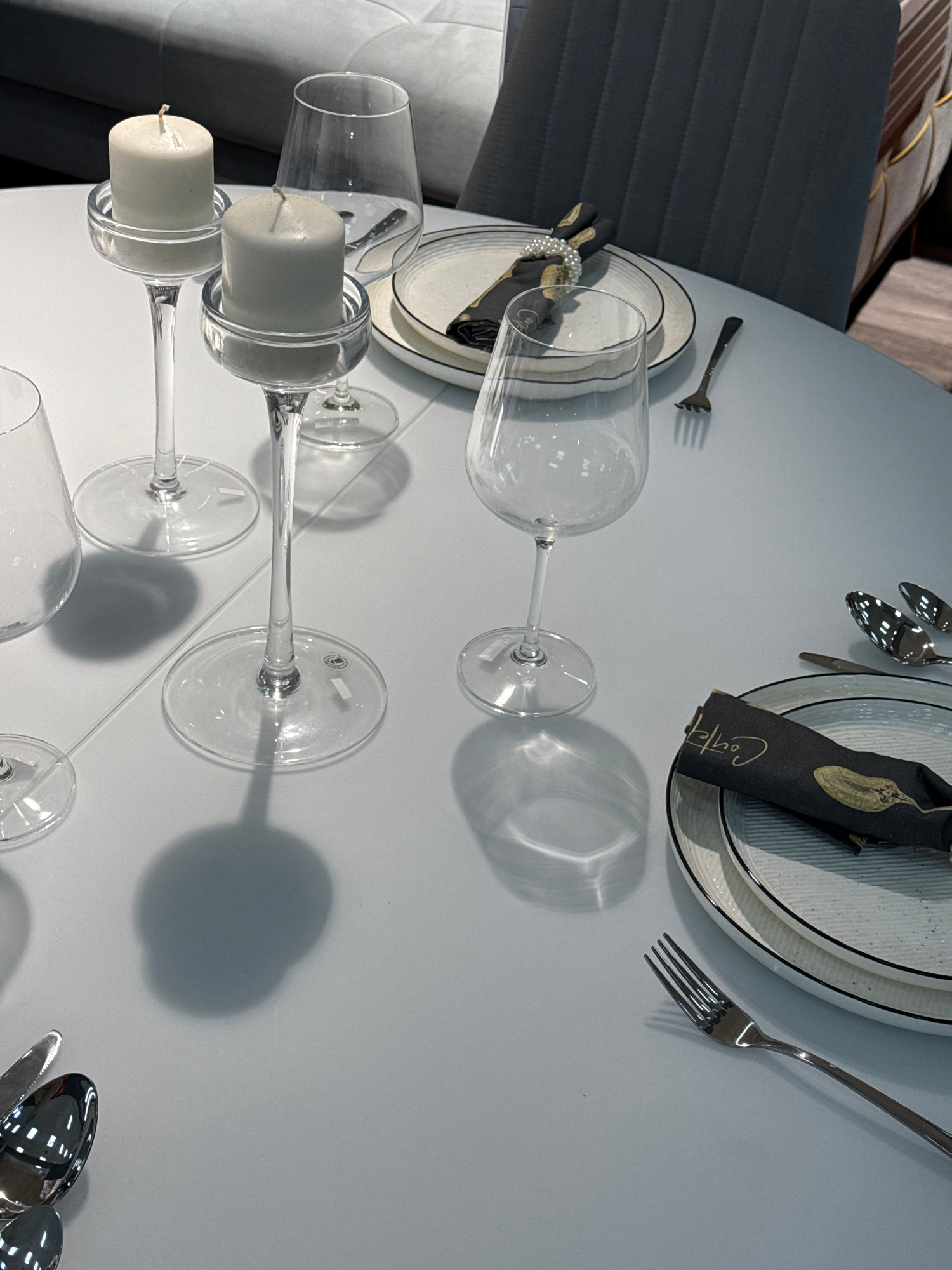 The scene captures a setting on a round, light grey table. There are dinnerware elements including plates, cutlery (knives and forks), and glasses, some with candles set within. The plates are predomi…read more
