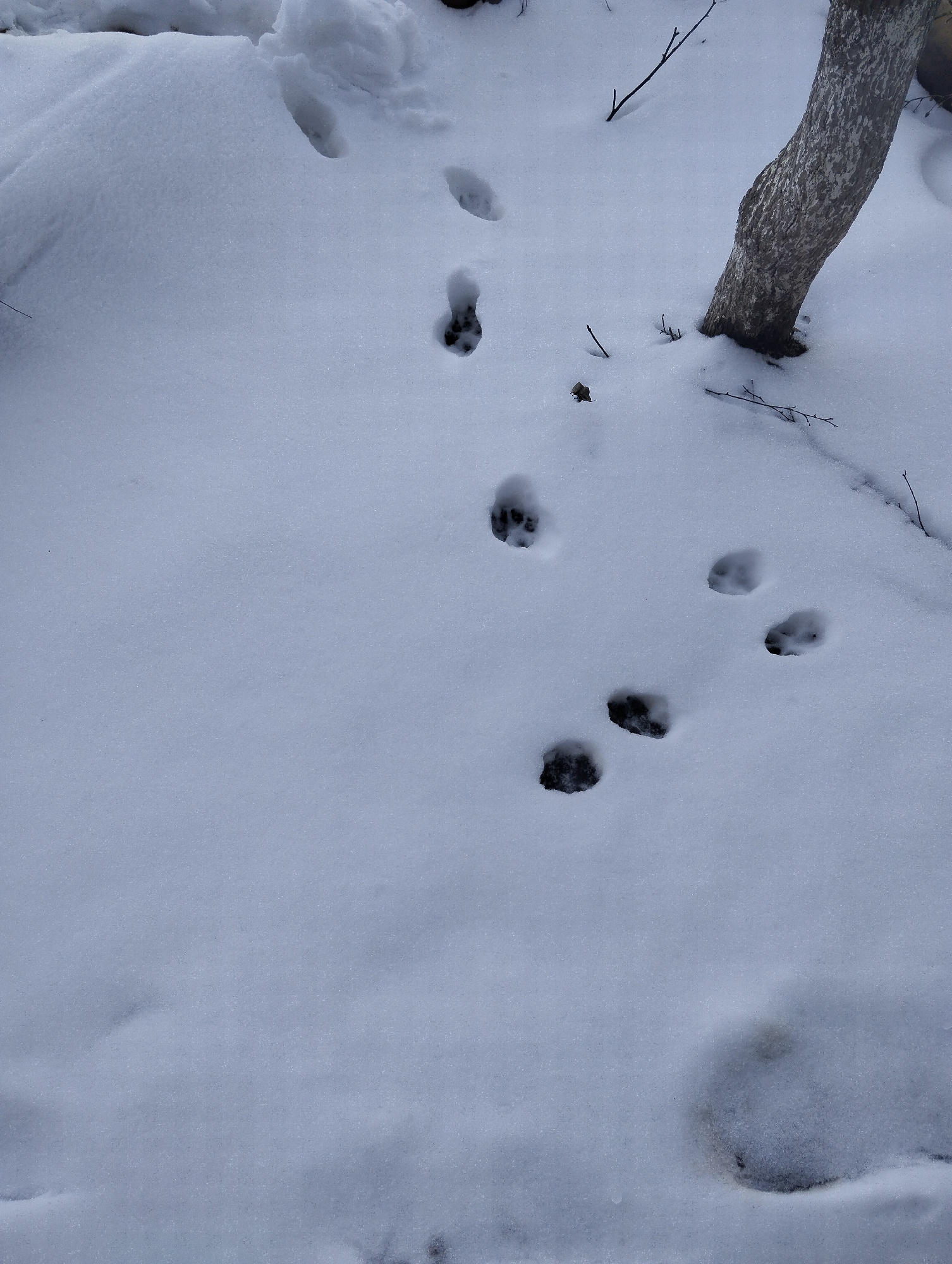 The image depicts a snowy landscape in an outdoor setting. A series of animal footprints are visible in the snow, leading from the top left to the center right of the frame. A tree trunk appears on th…read more