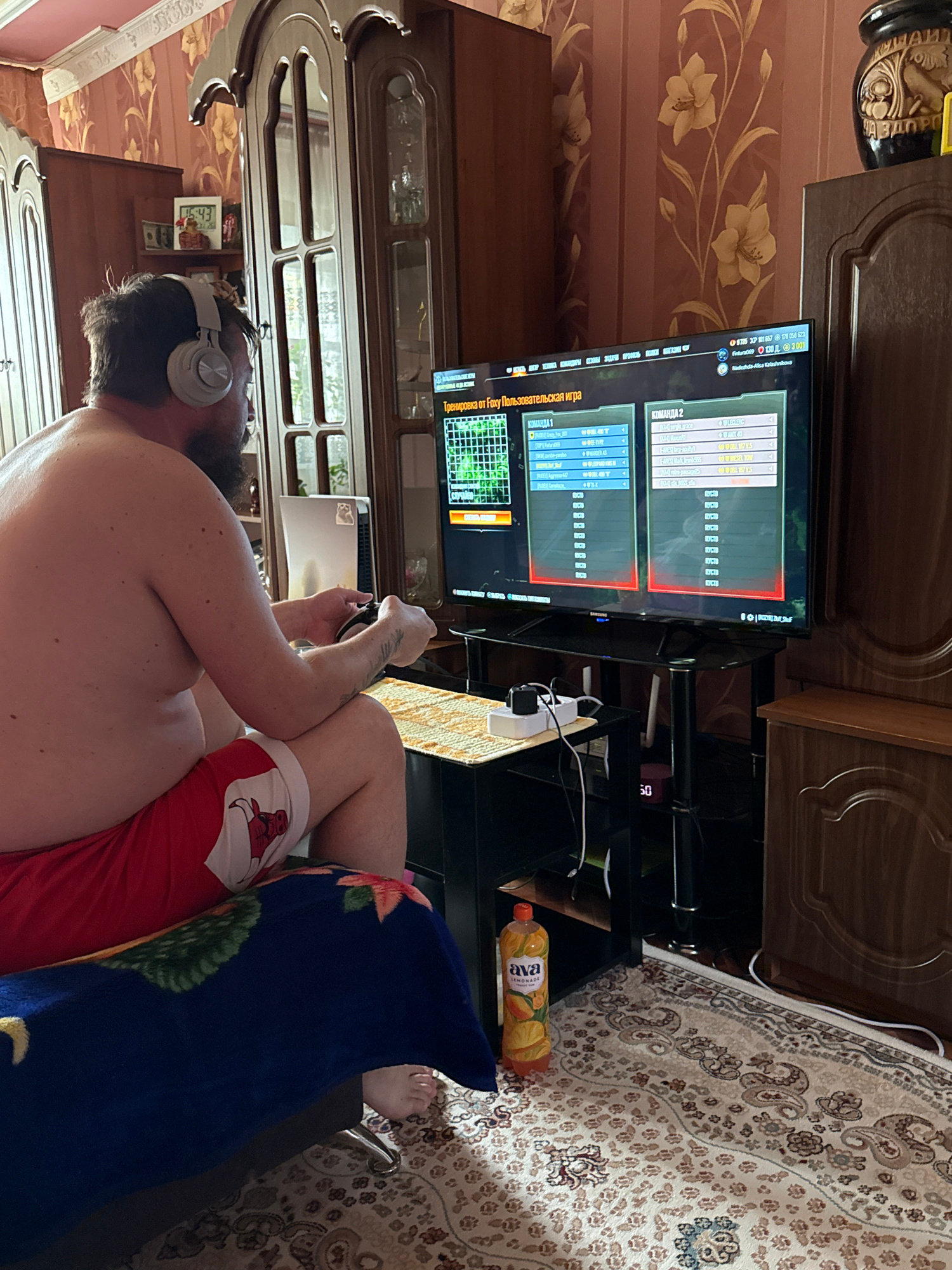 A man with headphones is sitting on a couch and playing a video game on a TV. He is wearing red shorts with a white band and a cartoon character on them. He is covered with a blue blanket with a floraβ¦read more