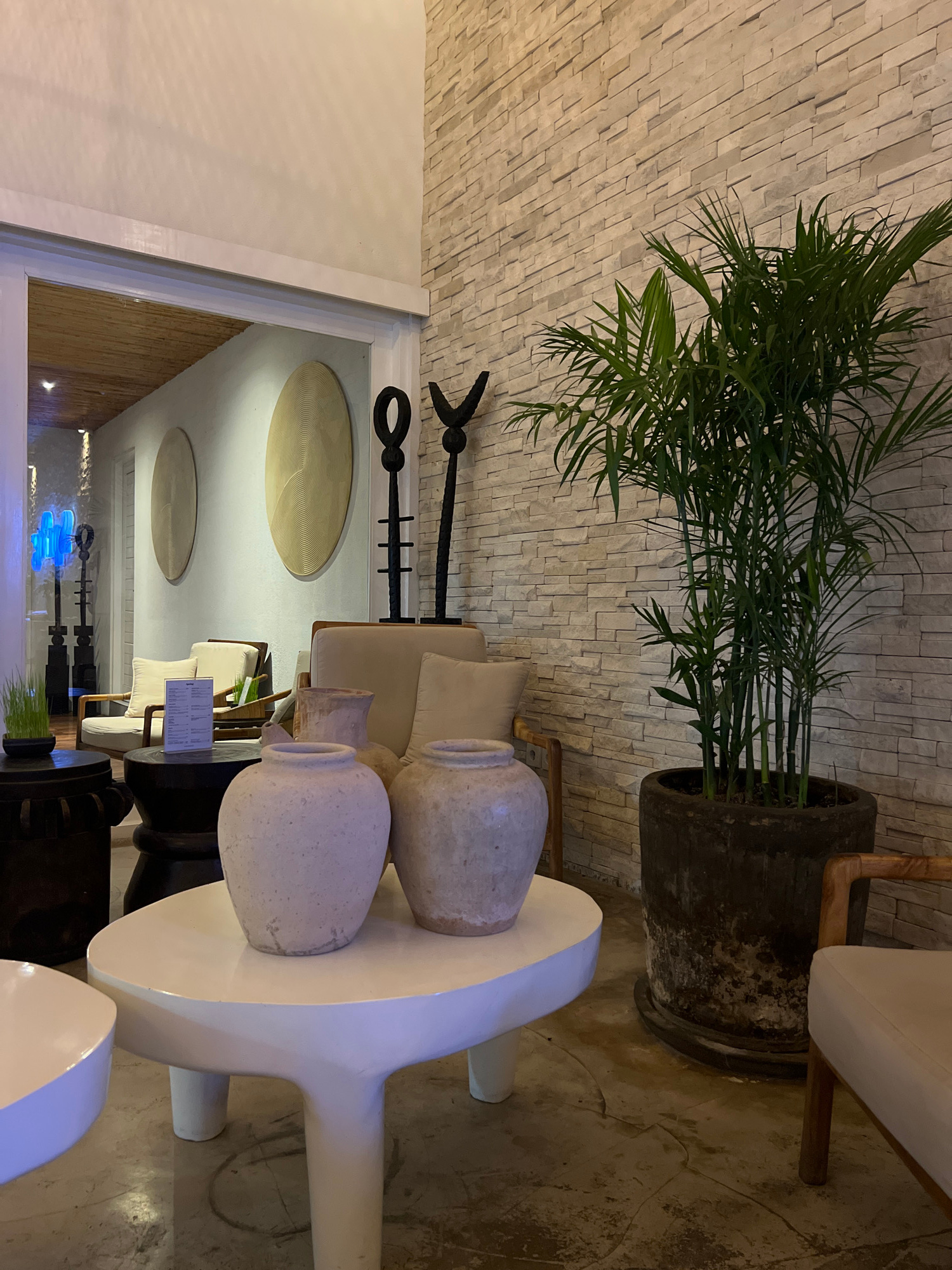 The image shows an interior space with a plant in a large pot in the upper right corner and a stone wall behind it. A white table with multiple decorative urns sits near the center. An elongated doorw…read more