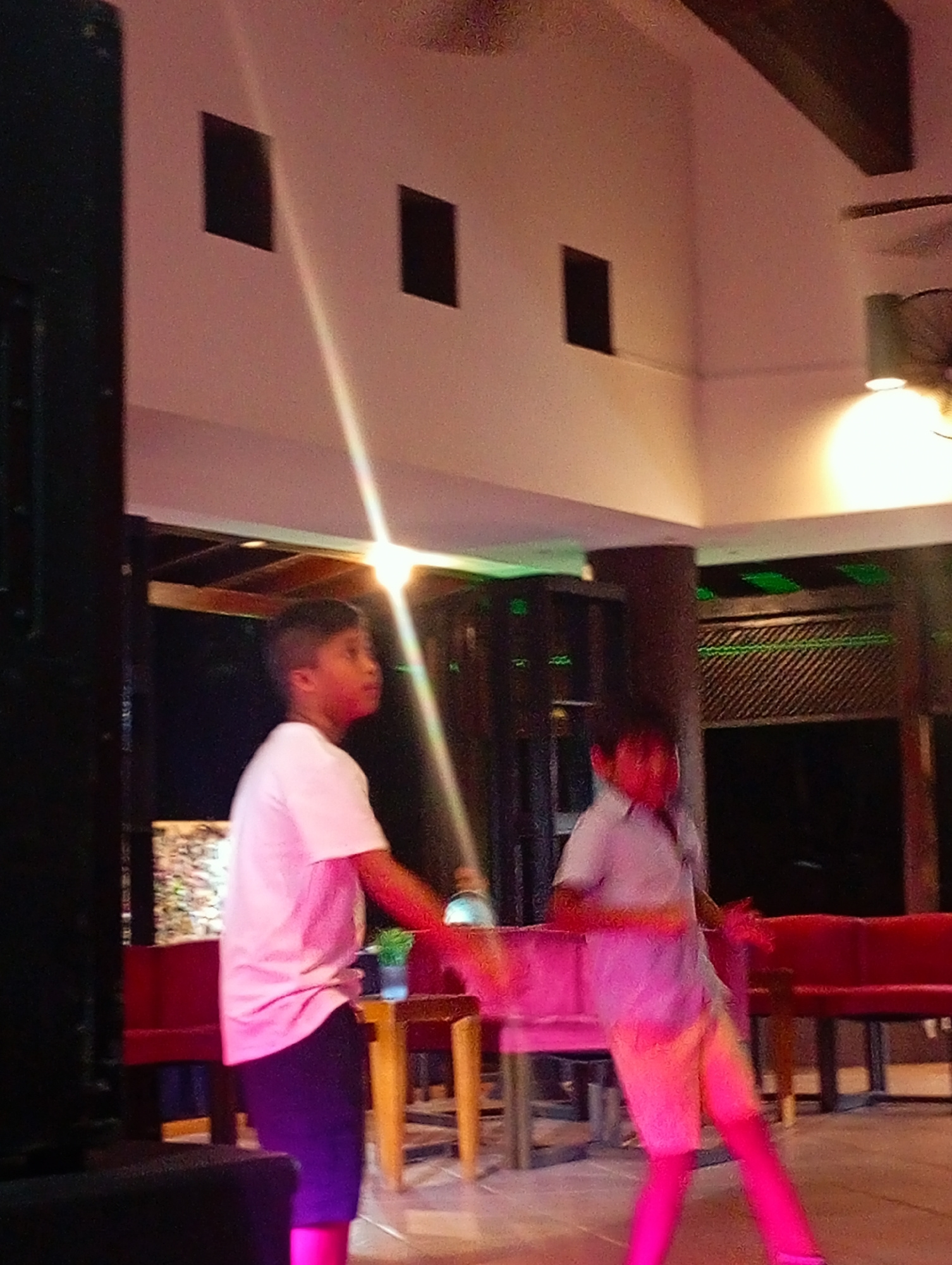 The image captures two young boys in an indoor setting, likely an event or performance space in Playa El Agua, Venezuela. The boy on the left wears a white t-shirt and dark shorts, looking to his righ…read more