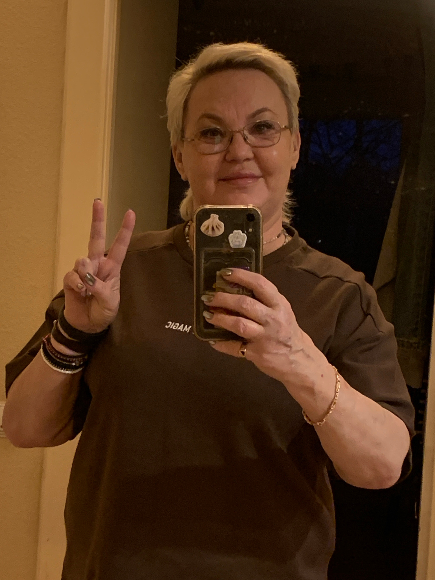 A woman with short blonde hair, wearing glasses and a brown T-shirt with the word "MAGIC" printed backward, is taking a selfie in what appears to be a mirror. She's holding her phone up and making a p…read more