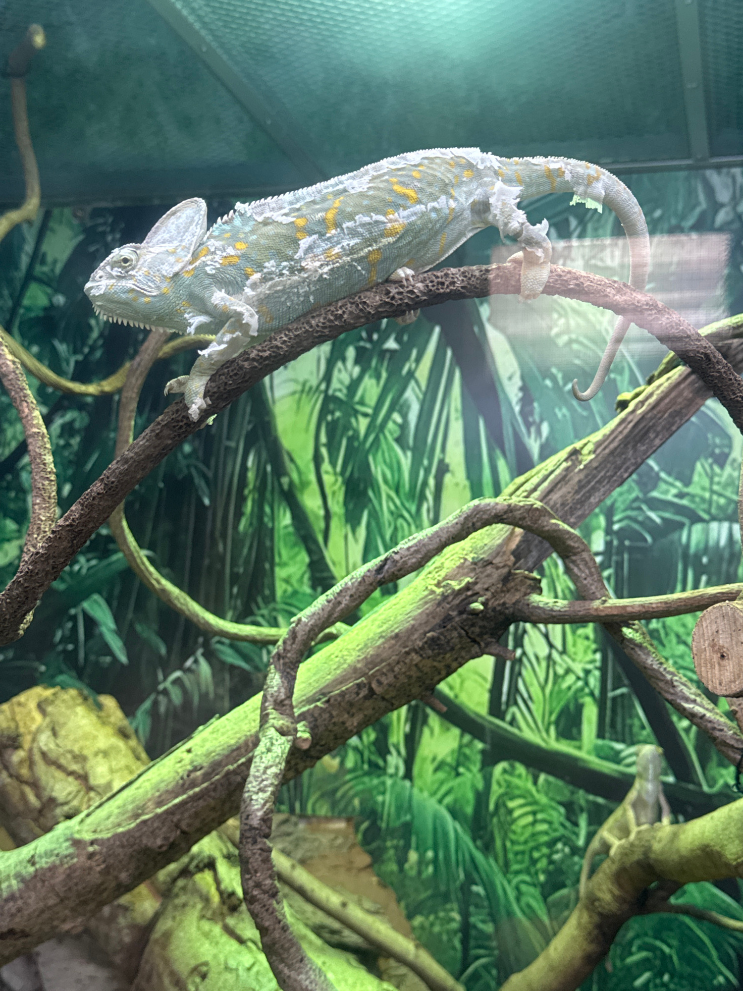 A chameleon is perched upside down on a branch. The chameleon is white with yellow markings and appears to be shedding its skin. The branch is brown and textured, and is part of a network of other bra…read more