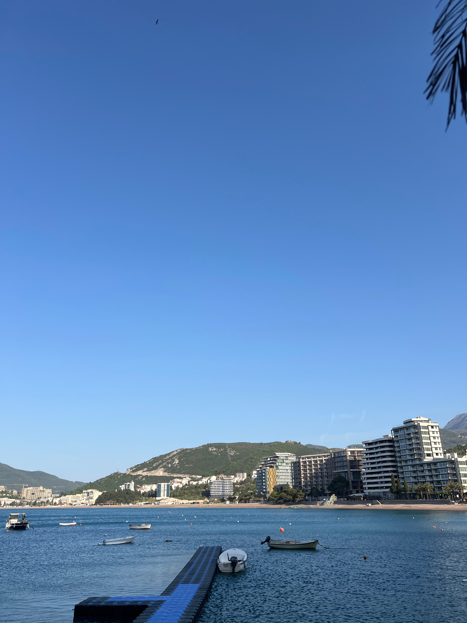 The image presents a bright, sunny coastal scene, likely Budva, Montenegro, viewed from a slightly elevated position over the water. The composition is horizontally dominated by a calm, rippled blue sβ¦read more