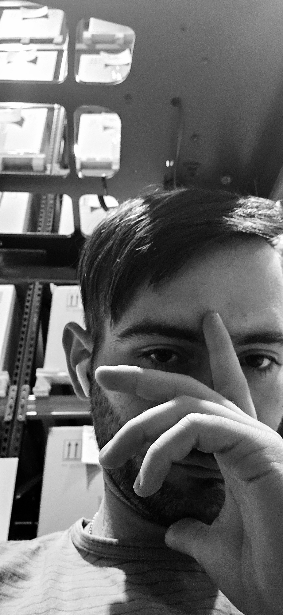 A black and white image, tilted on its side, captures a person looking towards the viewer while partially obscuring their face with their right hand. The person's left eye is clearly visible, making dā¦read more