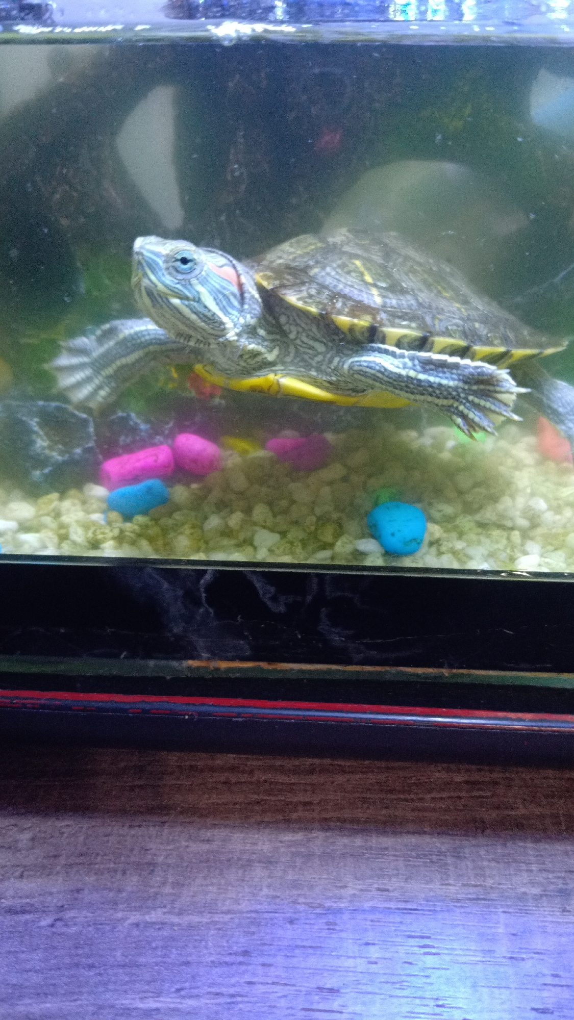 A red-eared slider turtle swims in an aquarium. The aquarium contains white gravel substrate, some colorful decorative rocks (pink, blue, and yellow), and a dark rock. The water is slightly murky. The…read more