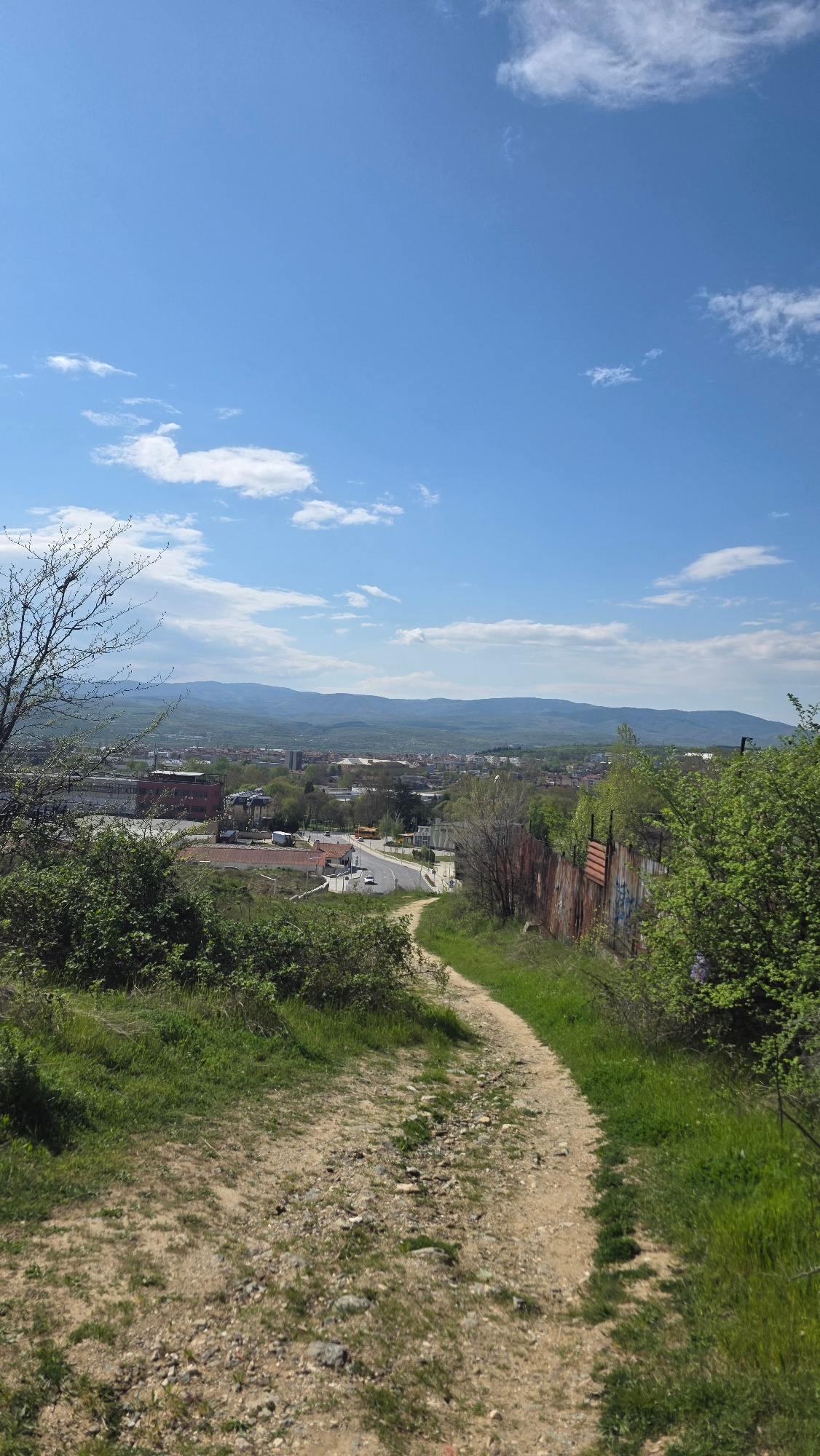 The image shows a view from a hill overlooking the city of Blagoevgrad, Bulgaria. A dirt path runs along the right side of the frame, lined with green grass and vegetation. A rusty fence is visible al…read more