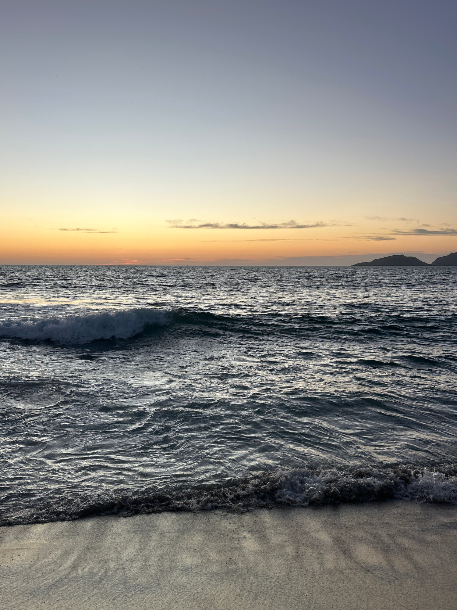 A wide-angle, slightly off-center aerial shot depicts a shoreline. The left side of the image shows a clear sky, transitioning into a golden hue closer to the horizon. The right side of the image feat…read more