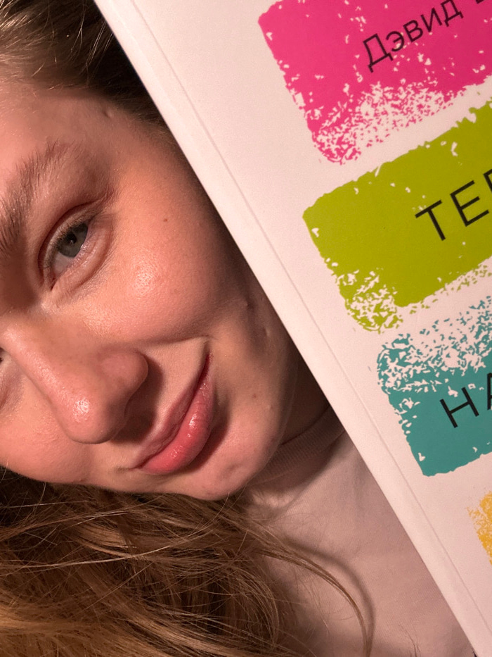 A person lies on their side, a book partially covering their forehead. The book has colorful paint strokes with Cyrillic text. The person has fair skin, blonde hair, and a single eye visible, looking…read more