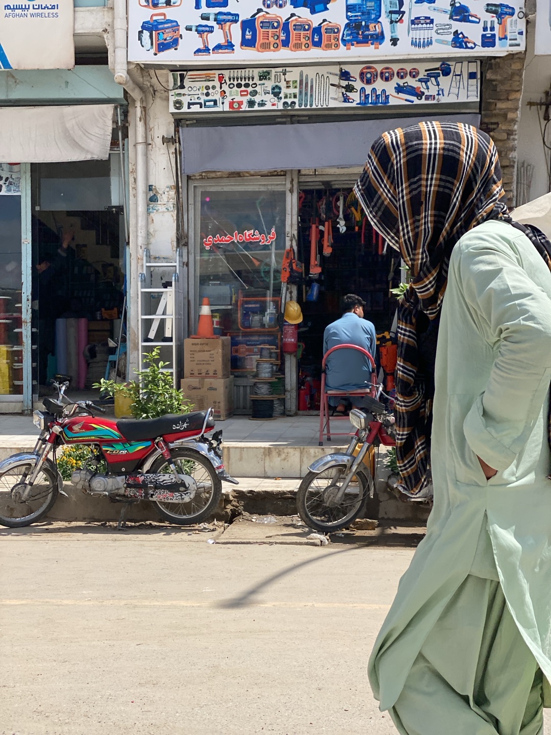 The photo was likely taken in Kandahar, Afghanistan, given the presence of the 'Afghan Wireless' sign. The scene depicts a street view with two motorcycles parked in front of two adjacent storefronts.…read more