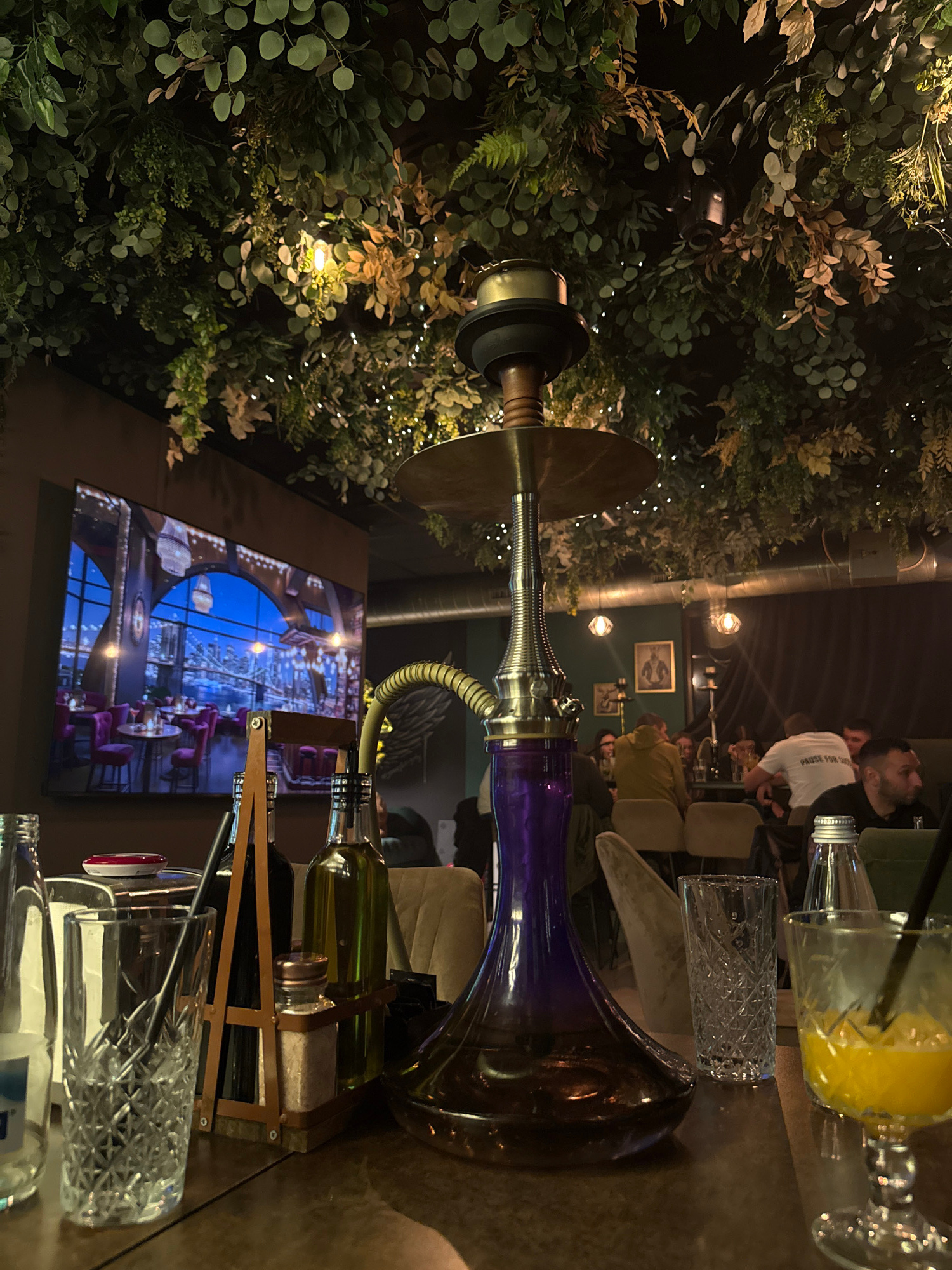 The image captures an indoor scene within a lounge or bar, likely during the evening or night, indicated by the ambient lighting. The setting features a wall extensively decorated with artificial gree…read more