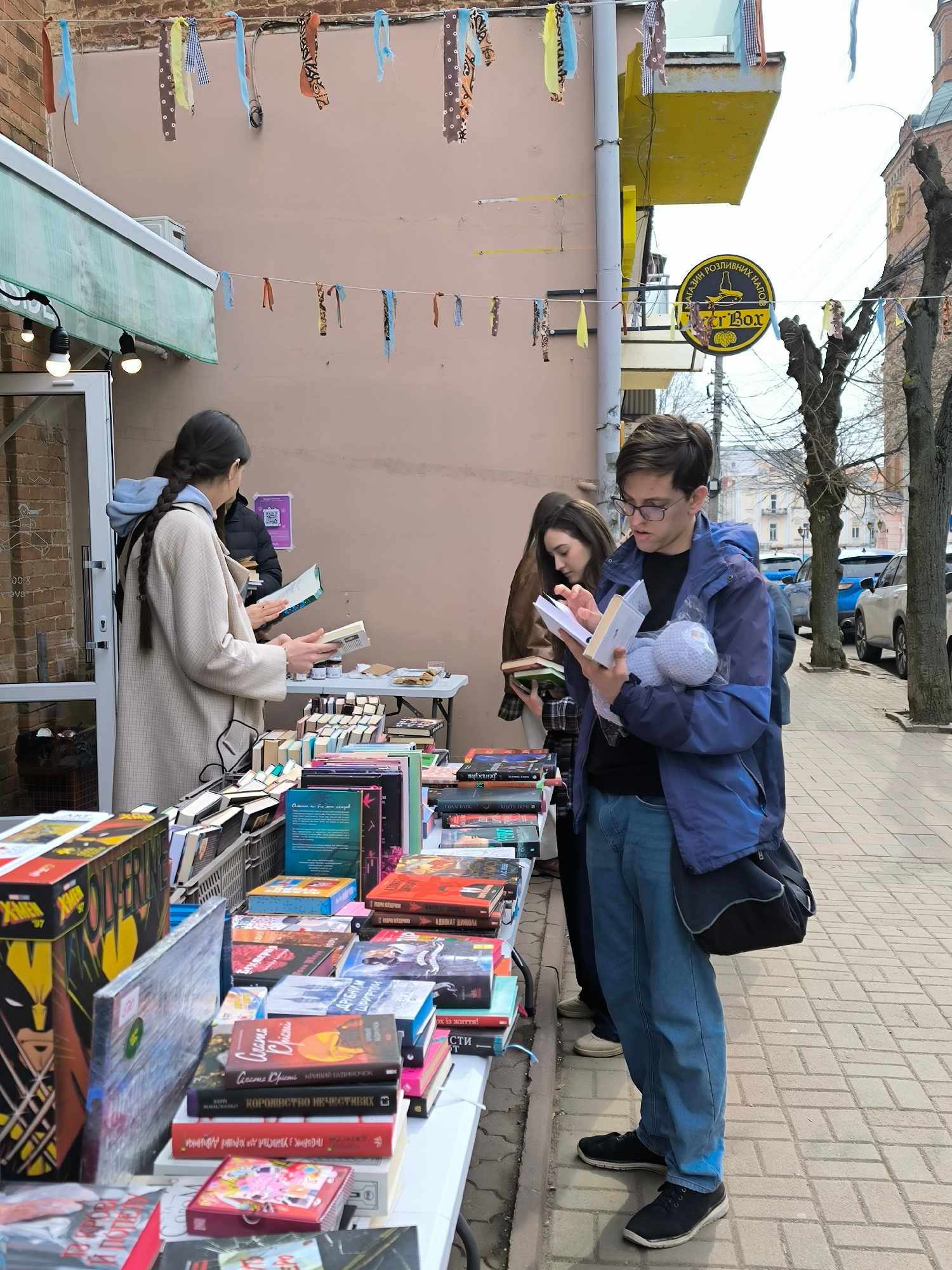 The image captures an outdoor book sale in Vinnytsia, Ukraine. A young man with glasses, wearing a blue jacket and jeans, is intently reading a book, holding a grey stuffed toy. Next to him, a woman i…read more