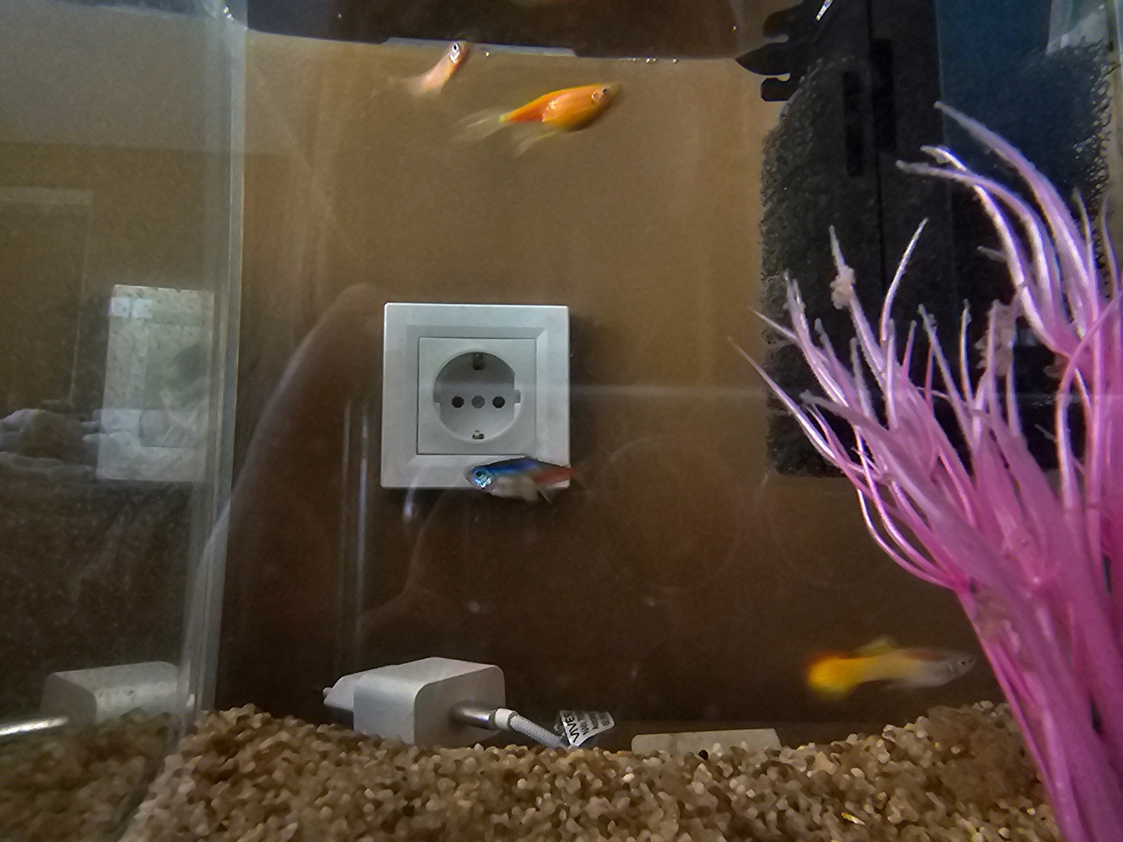 A close-up shot of an aquarium. Several small fish are visible inside. The aquarium has gravel substrate. A gray European-style electrical outlet is attached to the back wall of the tank. An object re…read more