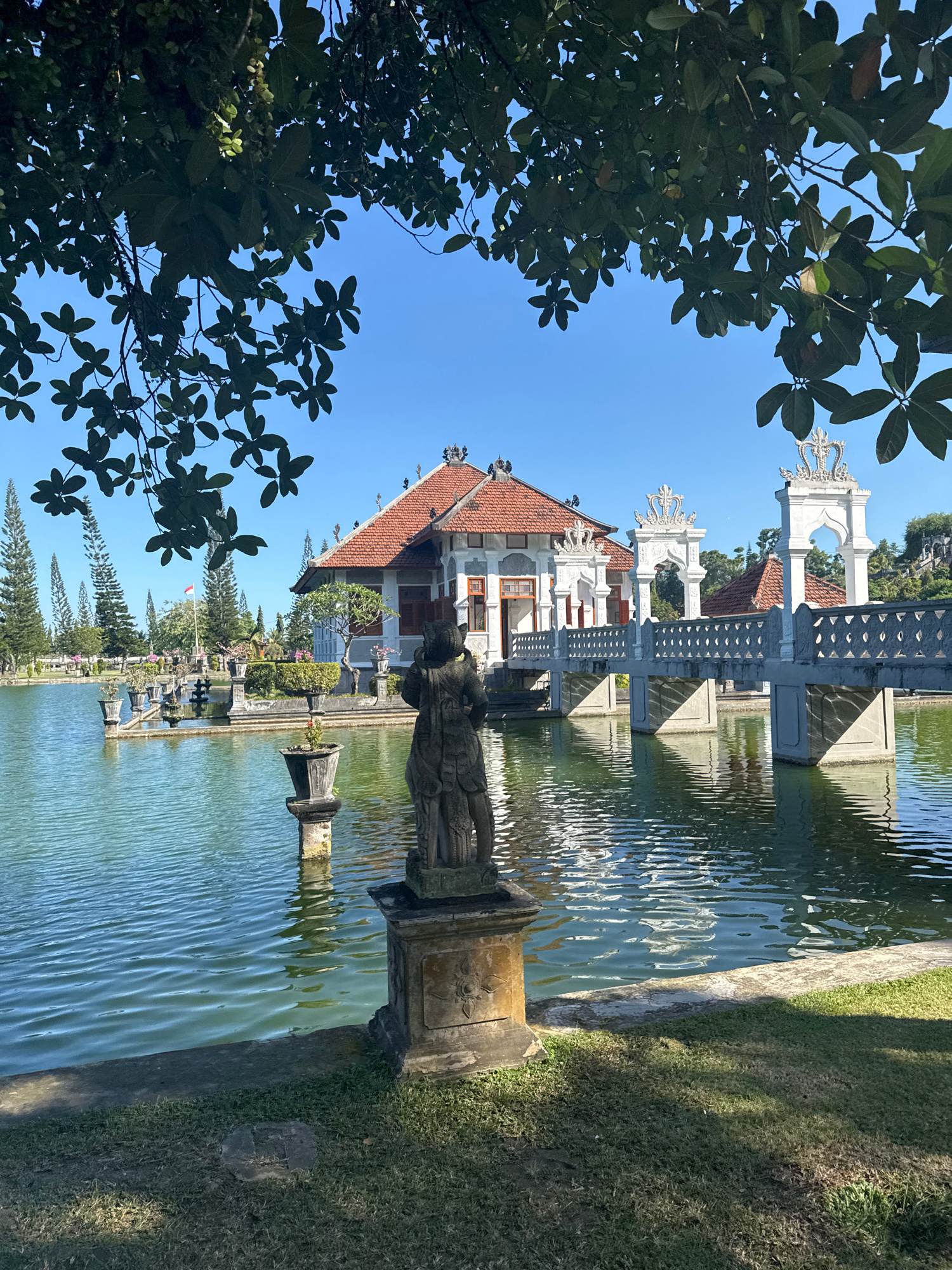 This image captures a serene and architecturally rich water palace or temple complex, likely in Karangasem, Indonesia. The scene is dominated by a large, tranquil body of water, possibly a pond or canβ¦read more