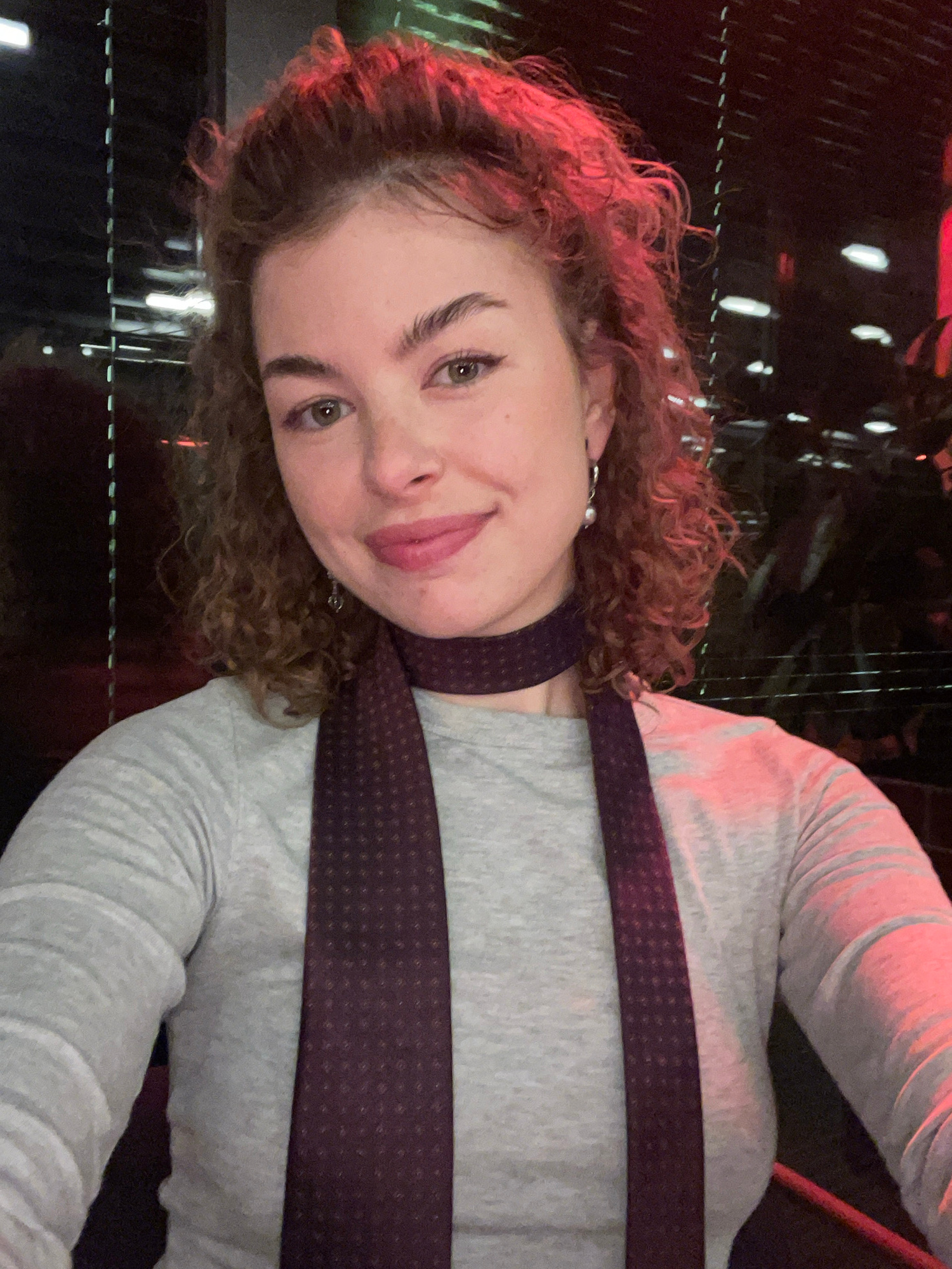 A woman is pictured indoors, likely in an entertainment venue, possibly in Tbilisi, Georgia. The environment is dark with blurred lights in the background, potentially a tunnel or decorative feature with mirrored walls. The woman has light skin, curly reddish-brown hair, and is wearing a grey long-sleeved shirt with a dark burgundy patterned tie or scarf around her neck. She is looking at the camera with a slight smile. The image orientation is rotated clockwise. | Open Wire