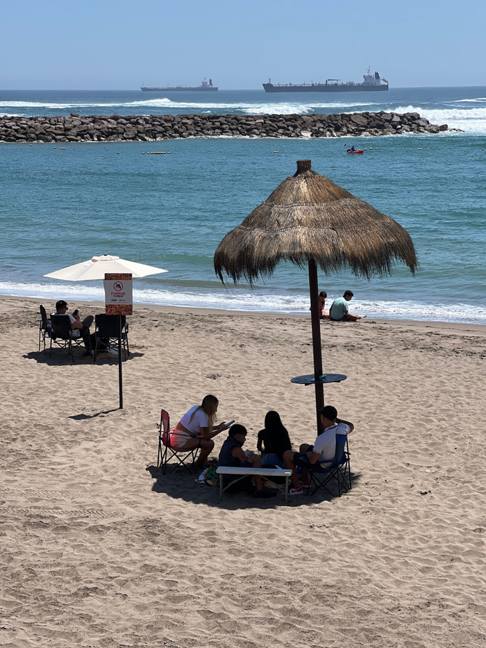 The image displays a daytime beach scene in Arica, Chile, under a clear blue sky. The foreground consists of light-colored sand, leading to the Pacific Ocean in the mid-ground and background. A dark,…read more