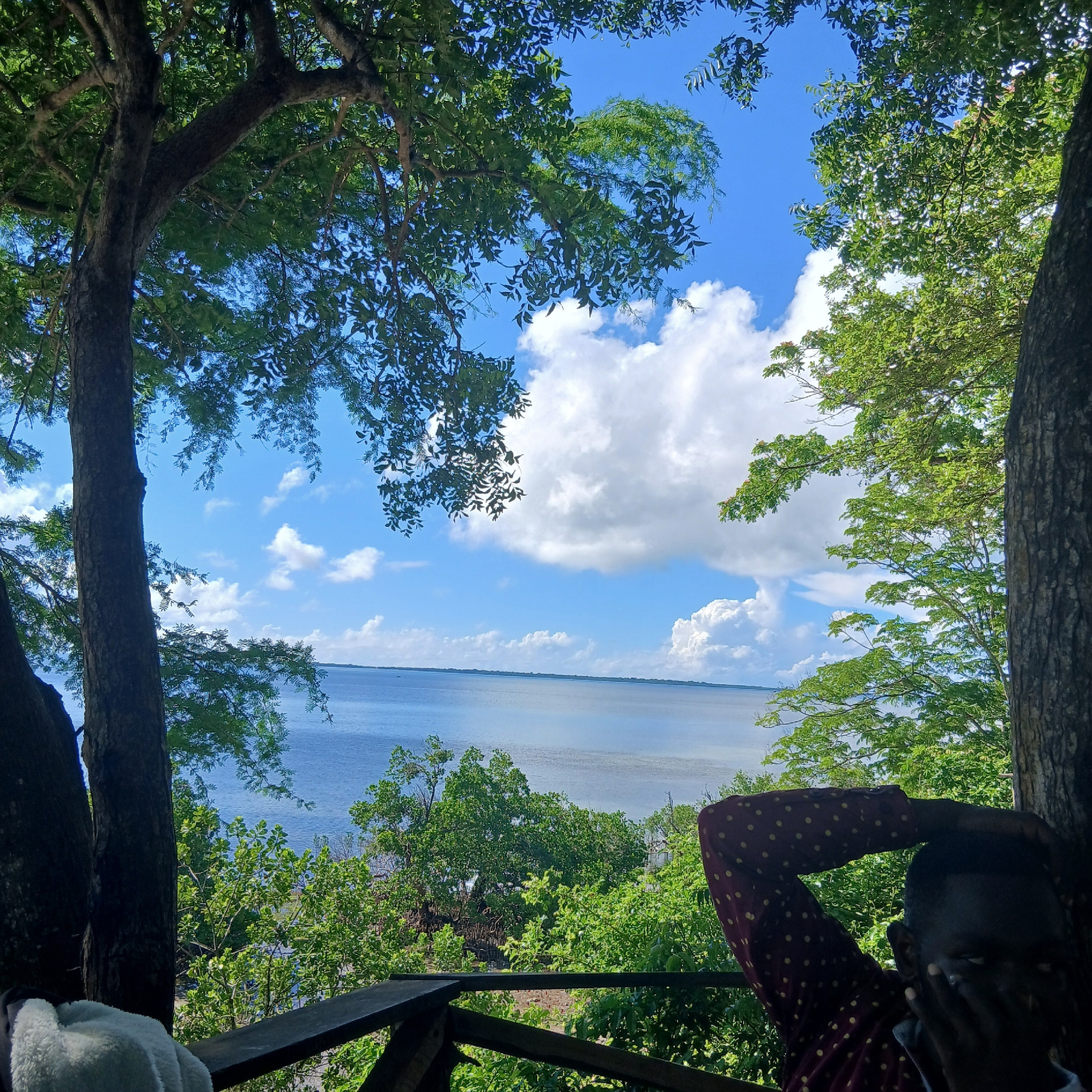The image depicts an elevated outdoor scene overlooking a large body of water, consistent with the Indian Ocean coastline in Tanga, Tanzania. The foreground features a partial view of a person on the…read more