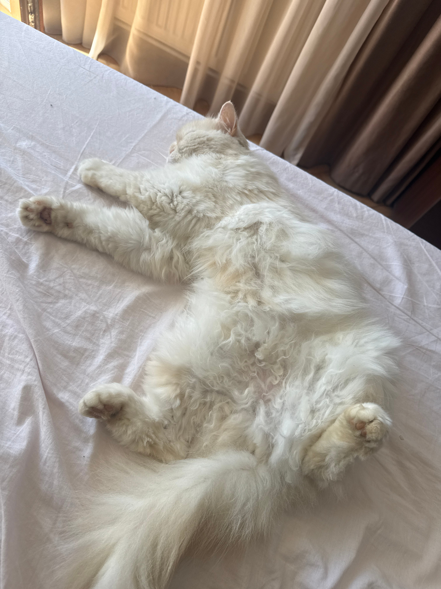 A fluffy white cat with long, slightly curly fur and subtle beige markings on its belly is shown sleeping deeply on its back. The cat is stretched out on a white, wrinkled bedsheet, with its front paw…read more