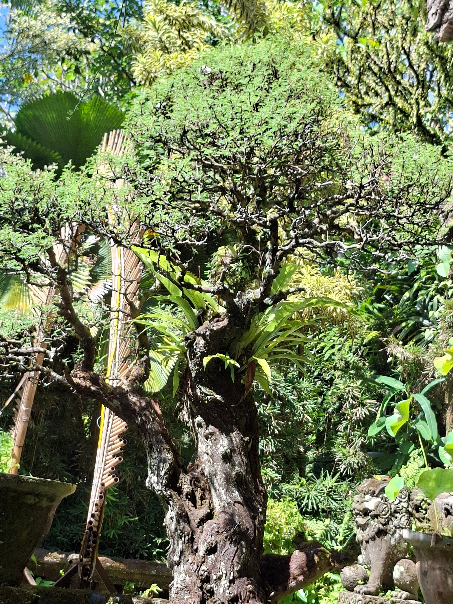 This image captures a vibrant, lush outdoor scene, likely within the Ubud District, Indonesia. The central subject is a majestic, gnarled tree with an ancient, textured trunk and intricate, dense bran…read more