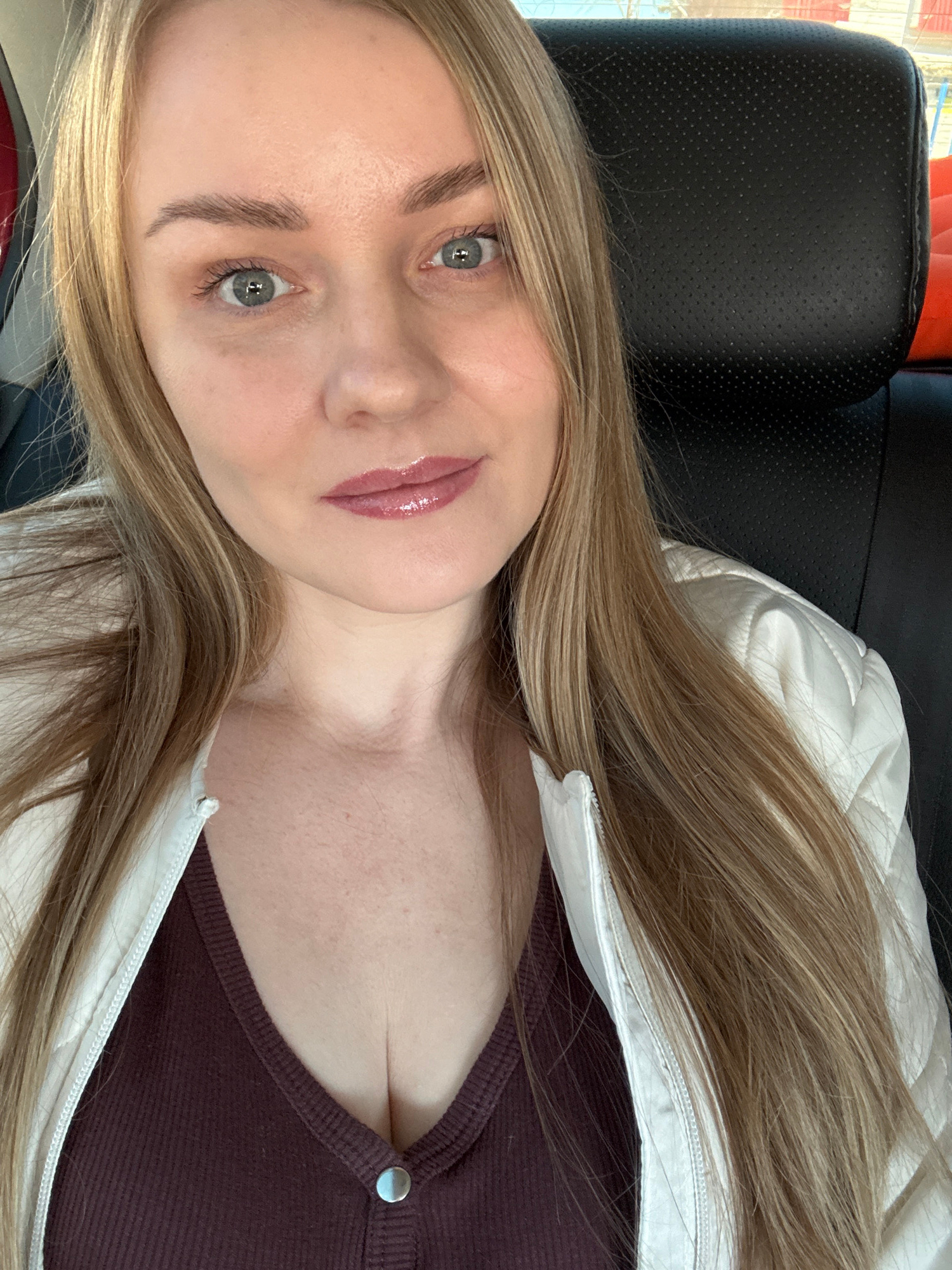A blonde-haired woman lies in a vehicle. She wears a brown top and a white puffy jacket. The location is unidentifiable as Chaikovsky, Russia, as there are no landmarks or other identifying features i…read more