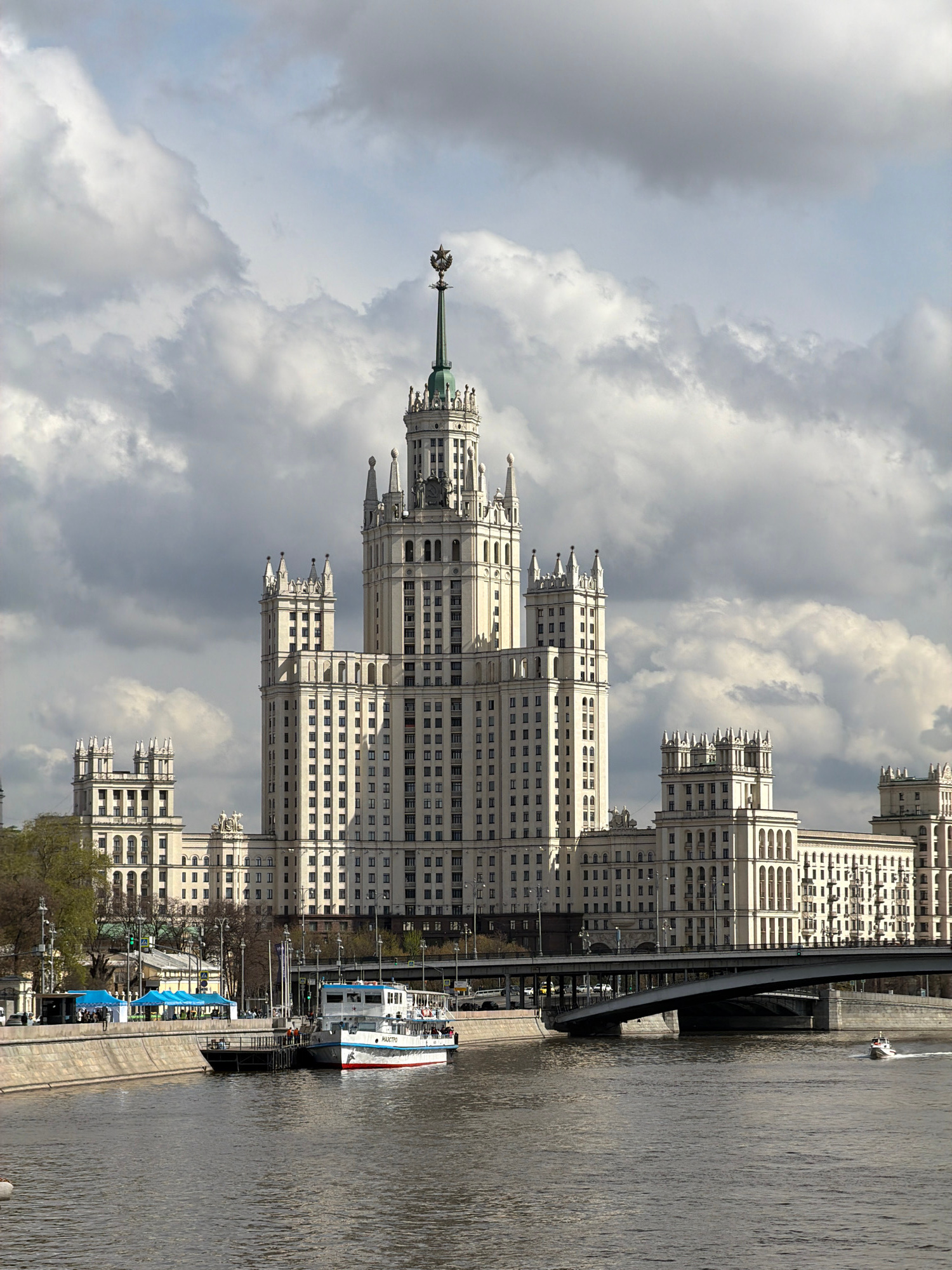 This image, when correctly oriented, depicts a vibrant urban scene along a wide river in Moscow, Russia. The most prominent feature is a large, ornate, light-colored skyscraper in the Stalinist Empire…read more