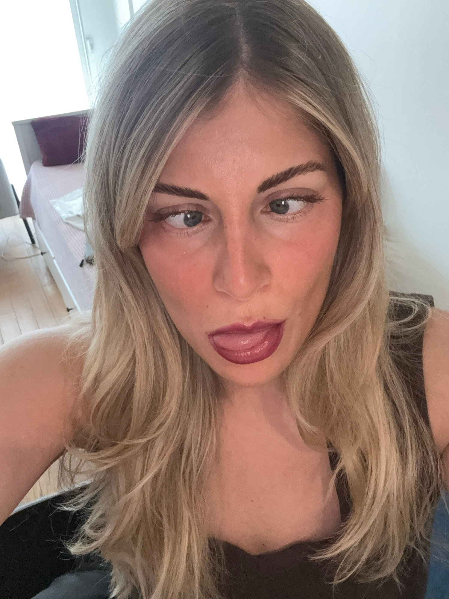 The media file presents a close-up portrait of a young woman, captured in a selfie style with a significant counter-clockwise tilt, orienting her head at an angle. She has fair skin, prominent and welโฆread more