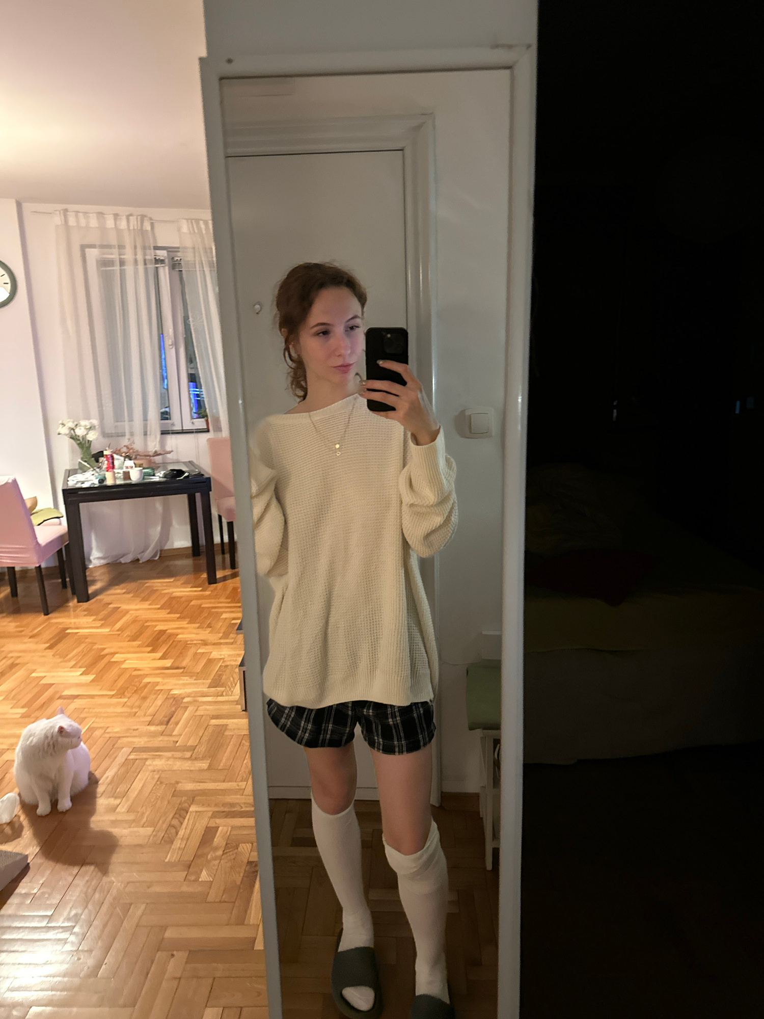 A young woman is taking a mirror selfie. She is wearing a cream-colored sweater, a plaid skirt, and white knee-high socks with dark sandals. She is holding a smartphone up to her face, and her reflect…read more
