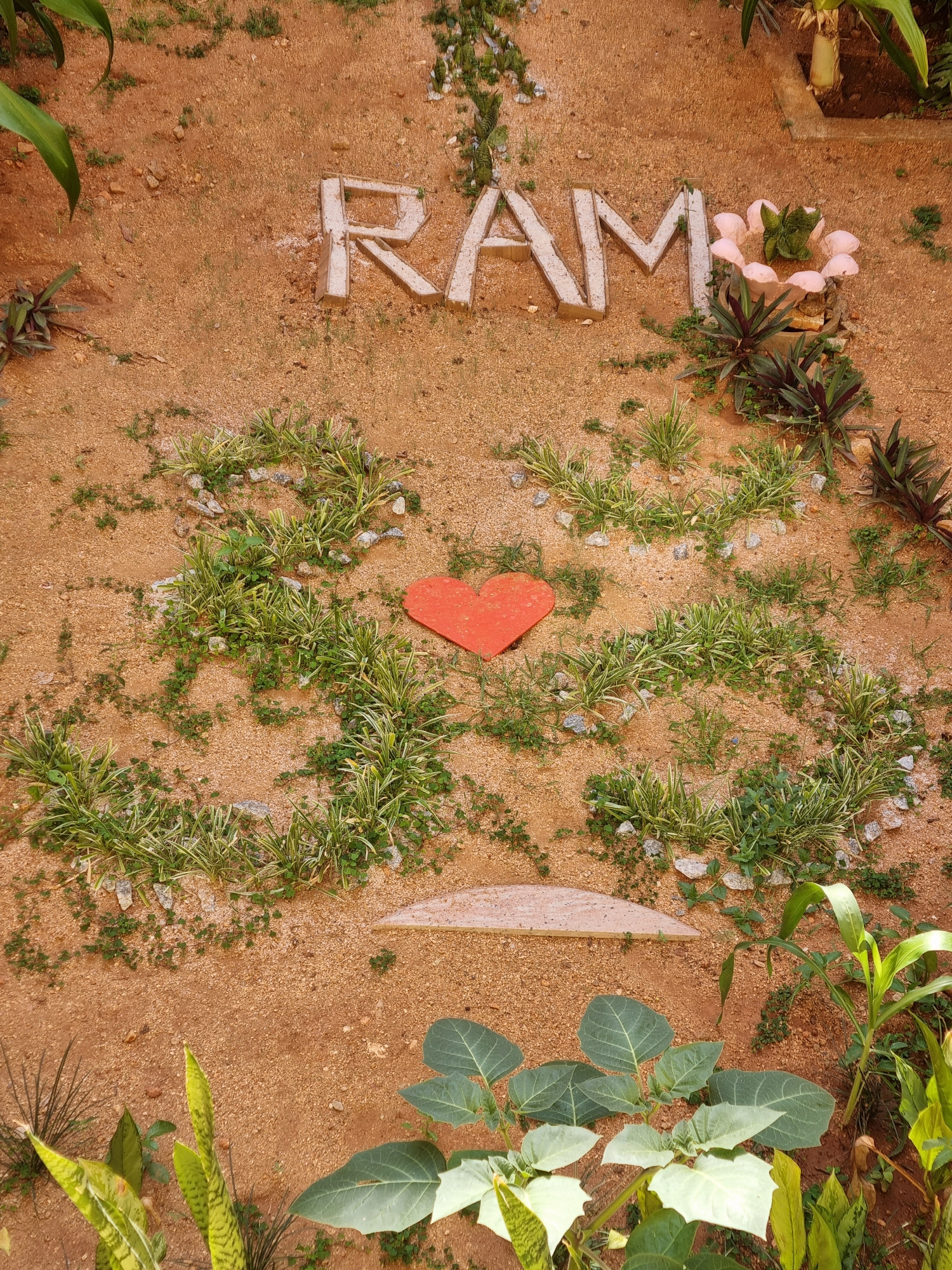 The image depicts a ground-level view in an outdoor setting, most likely a garden or yard. The ground is covered in reddish-brown soil or sand, scattered with small rocks and patches of grass. In theβ¦read more