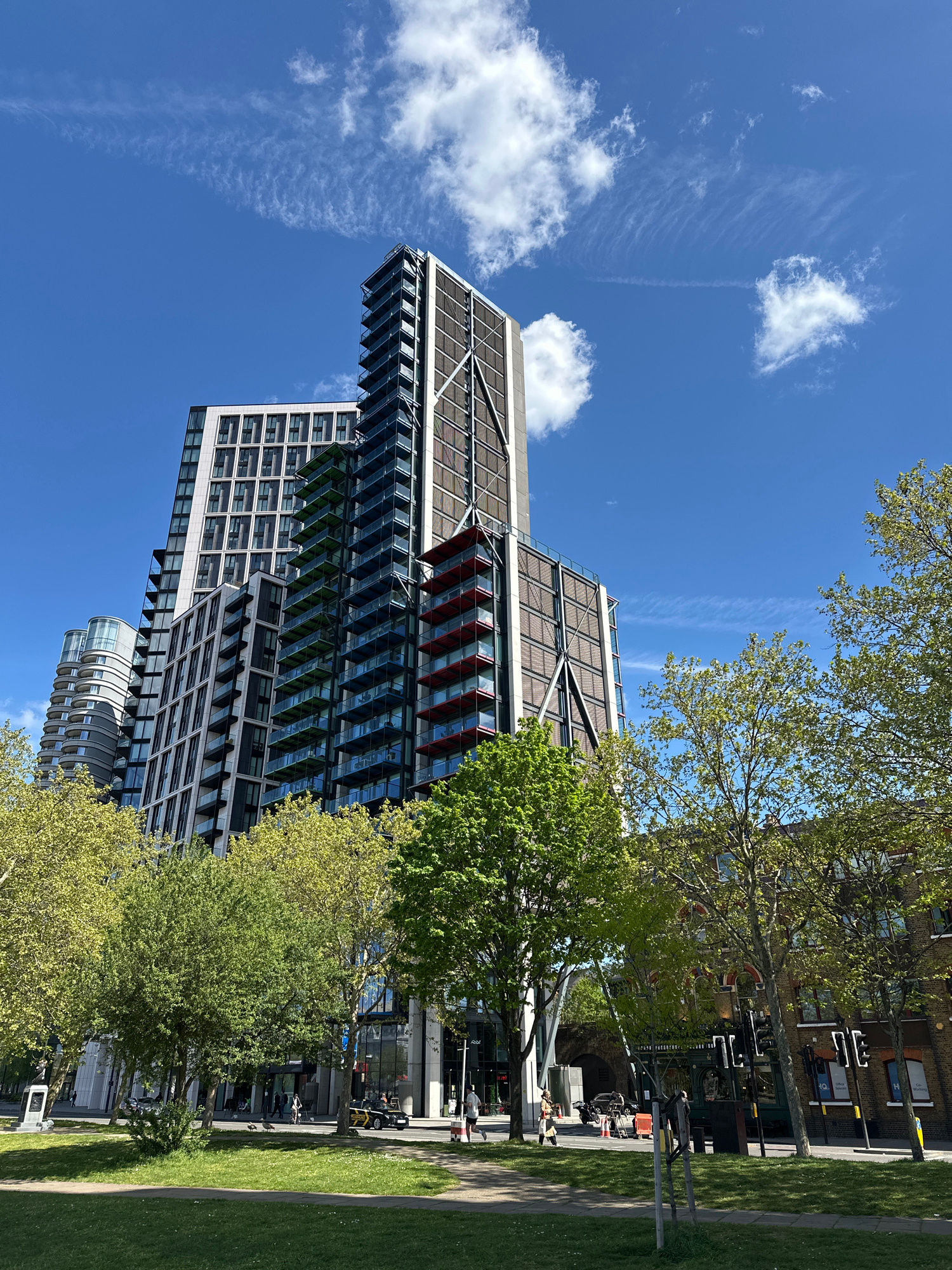 The image depicts a modern architectural landscape in London, United Kingdom. A high-rise building dominates the scene, showcasing a sleek, contemporary design with a mix of glass and metal structures…read more